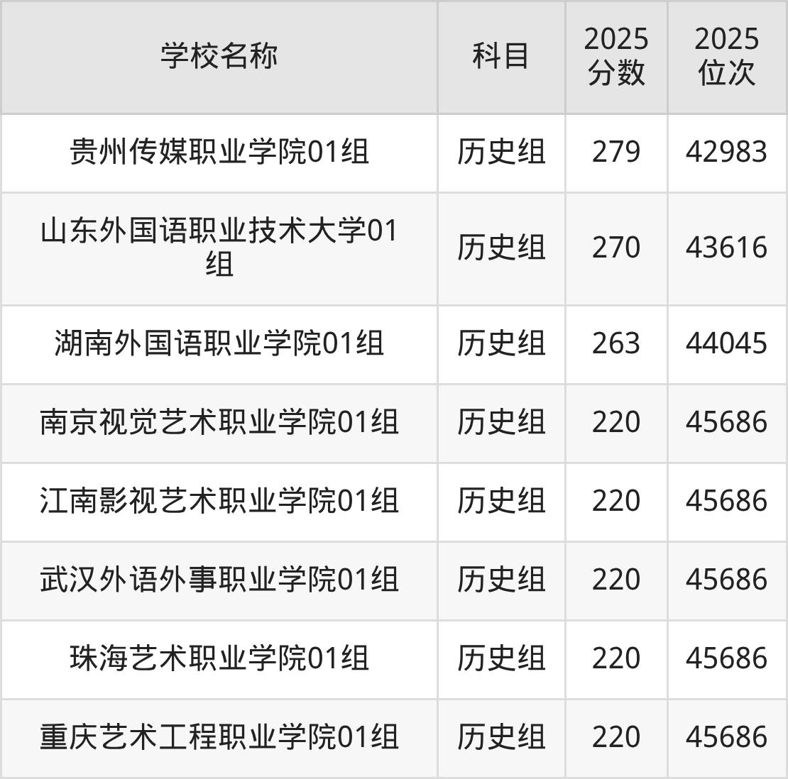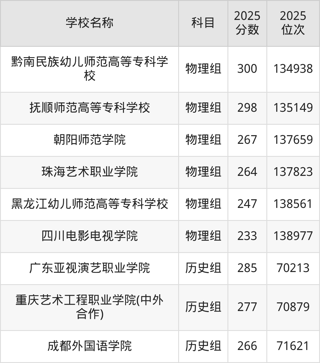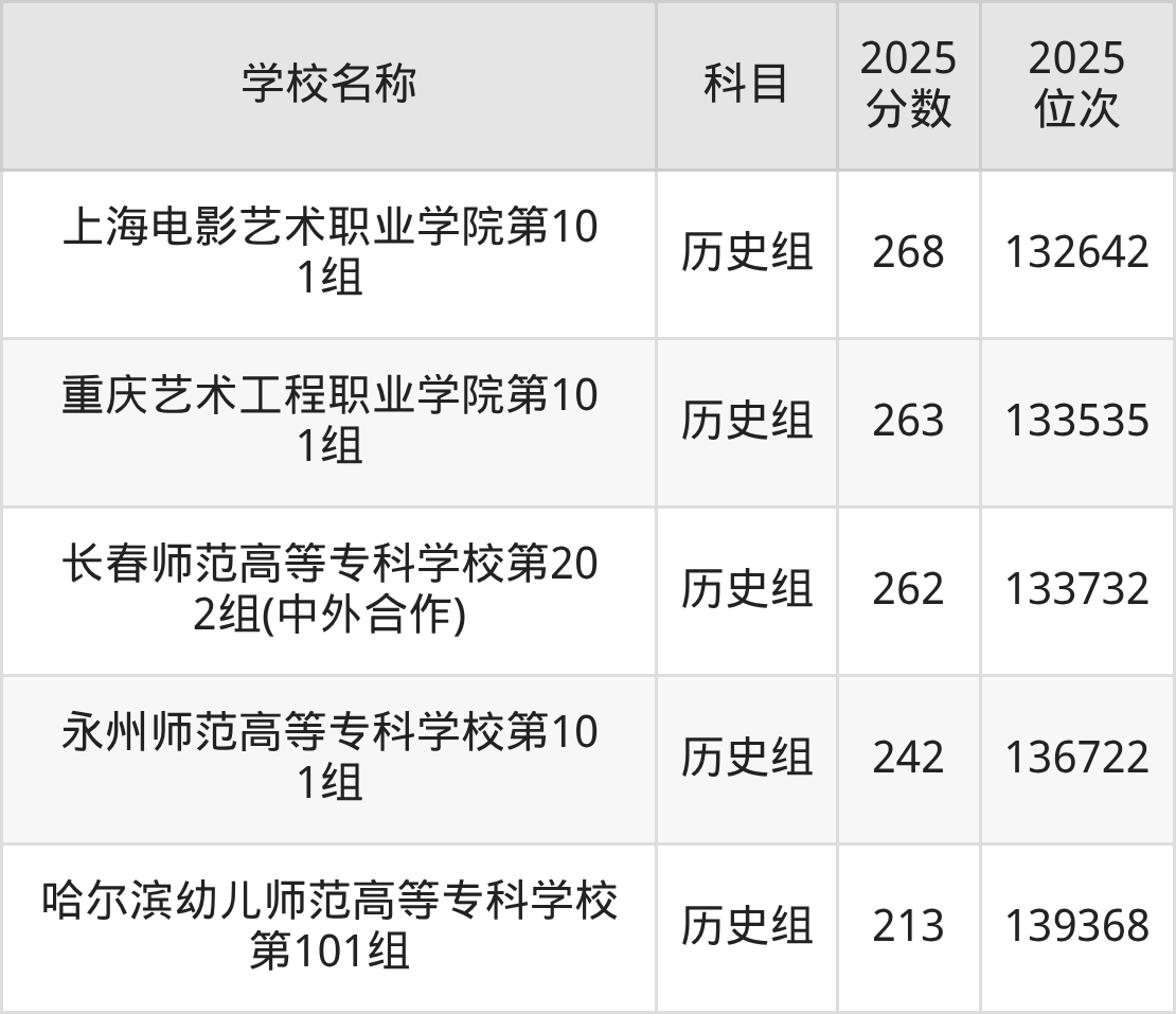 重庆高考历史组共有3所文科大学在200到300分之间录取,包含广东亚视演艺职业学院、重庆艺术工程职业学院(中外合作)、成都外国语学院。
