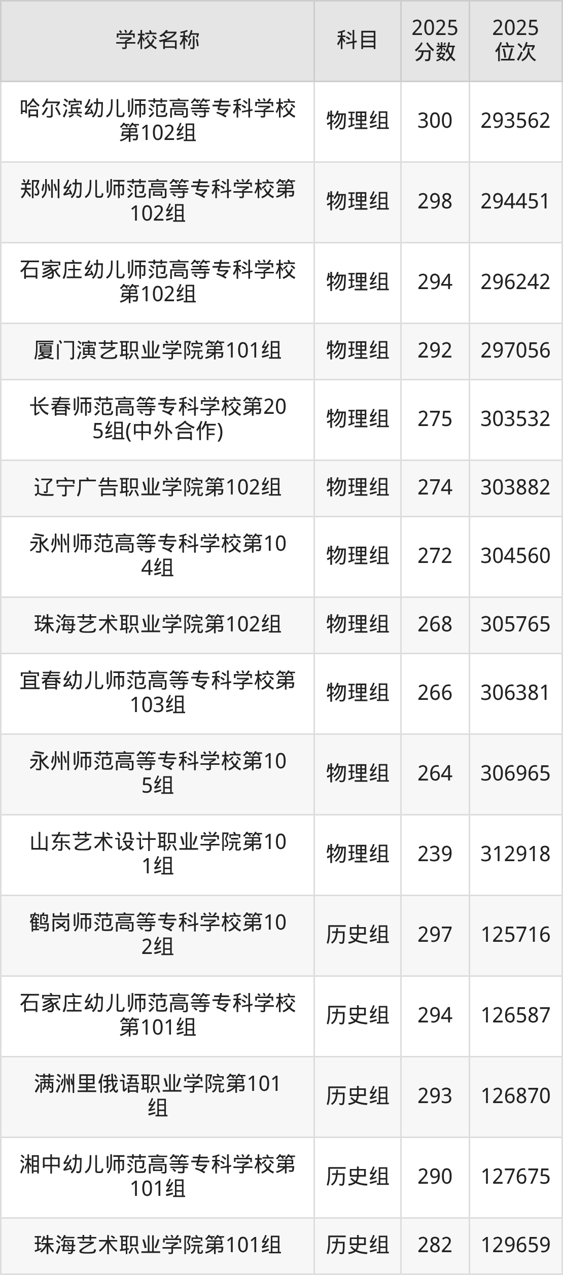 湖南高考历史组共有10所文科大学在200到300分之间录取,包含鹤岗师范高等专科学校、石家庄幼儿师范高等专科学校、满洲里俄语职业学院、湘中幼儿师范高等专科学校、珠海艺术职业学院、上海电影艺术职业学院、重庆艺术工程职业学院、长春师范高等专科学校、永州师范高等专科学校、哈尔滨幼儿师范高等专科学校。