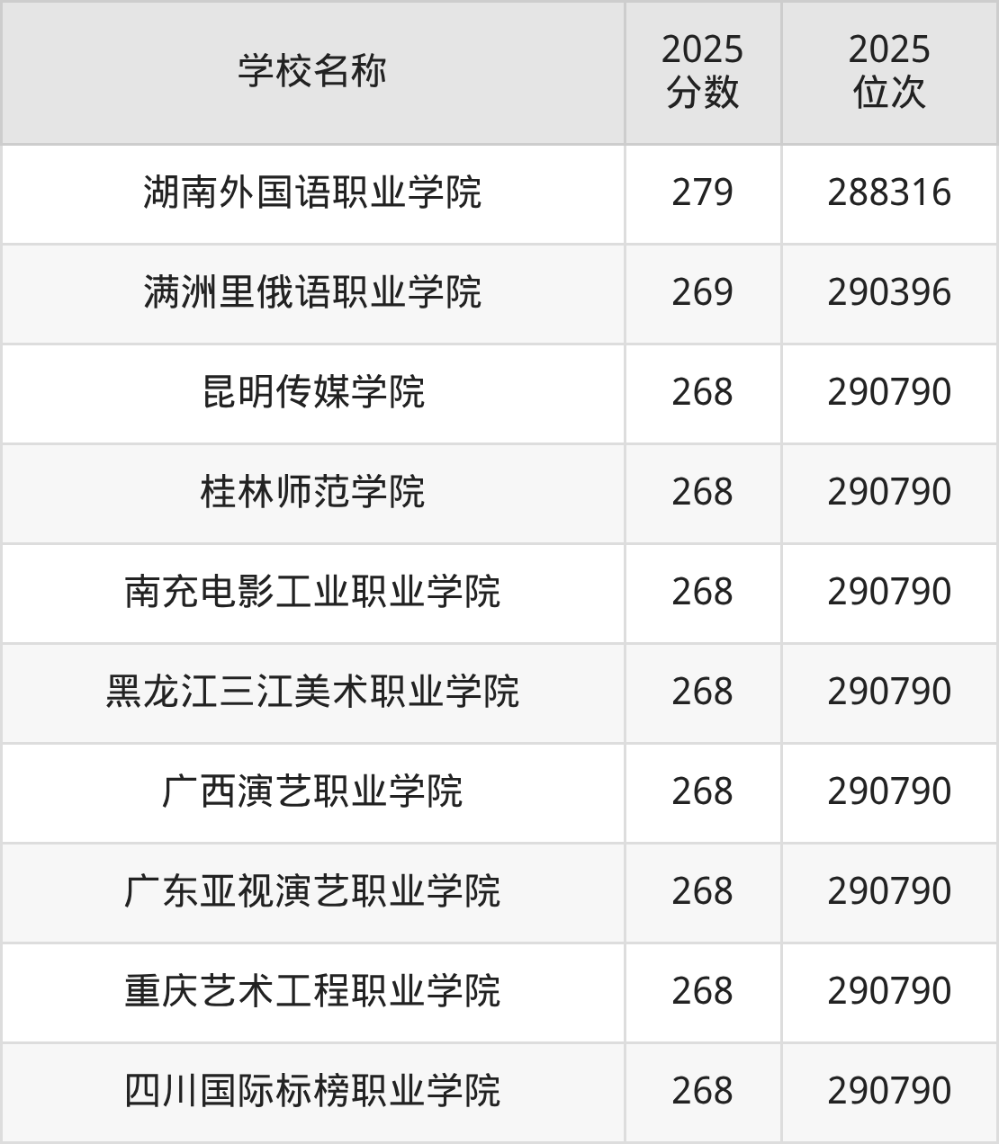 浙江高考共有10所文科大学在200到300分之间录取,包含湖南外国语职业学院、满洲里俄语职业学院、昆明传媒学院、桂林师范学院、南充电影工业职业学院、黑龙江三江美术职业学院、广西演艺职业学院、广东亚视演艺职业学院、重庆艺术工程职业学院、四川国际标榜职业学院。