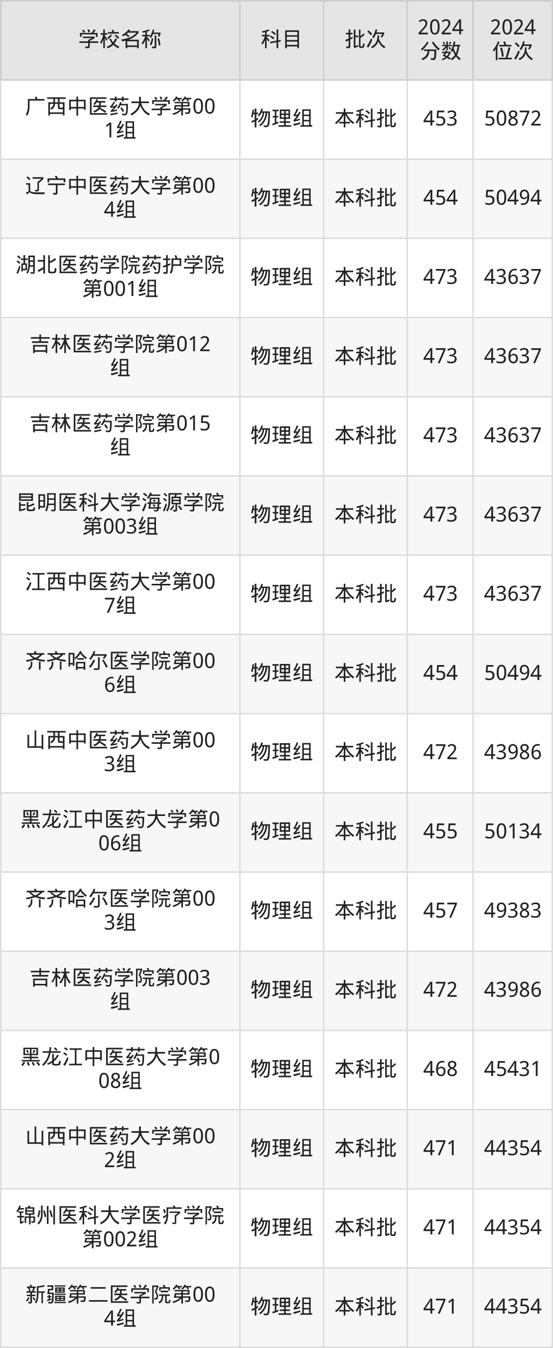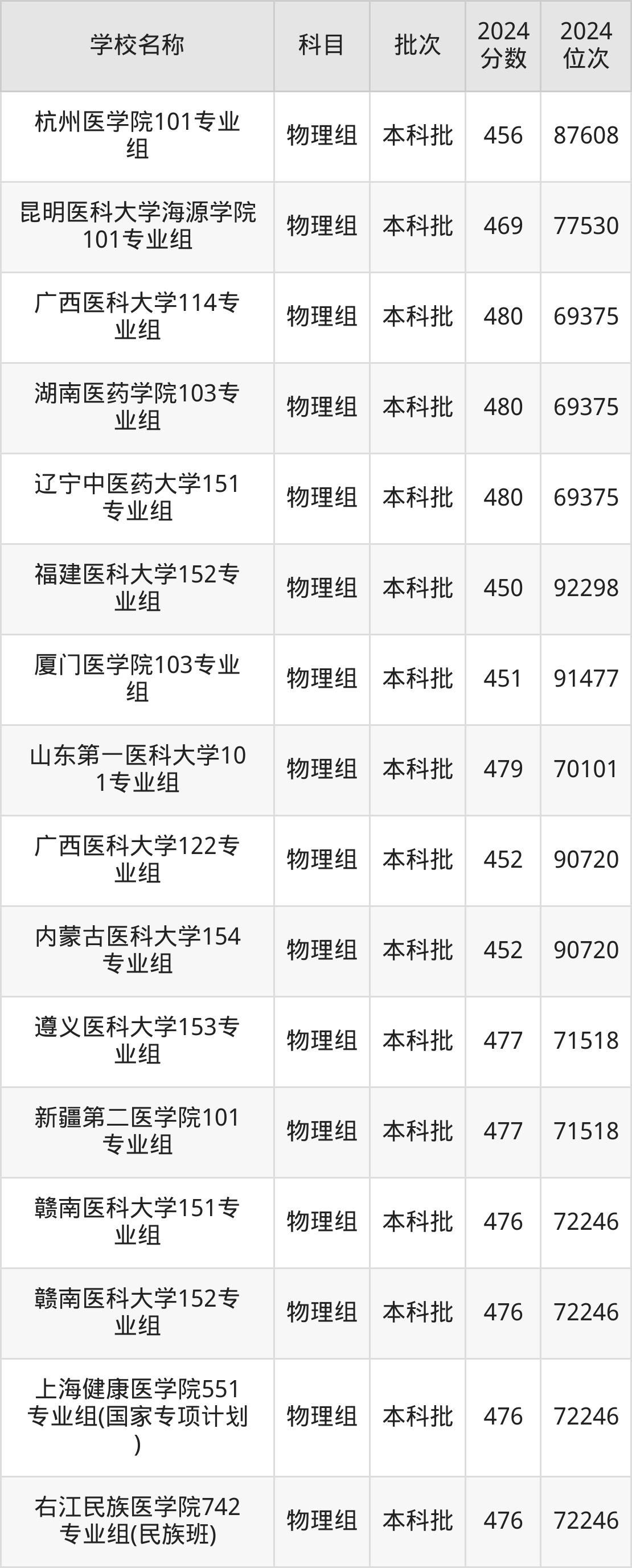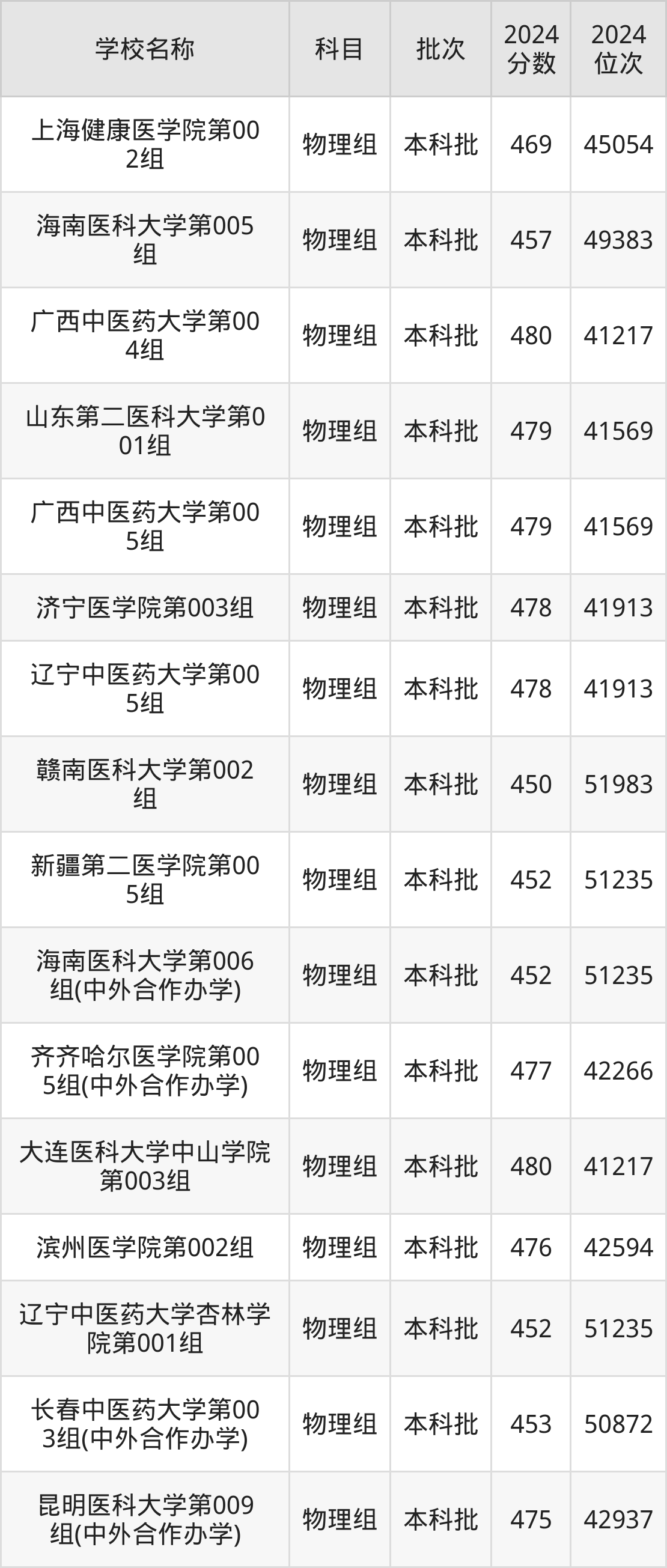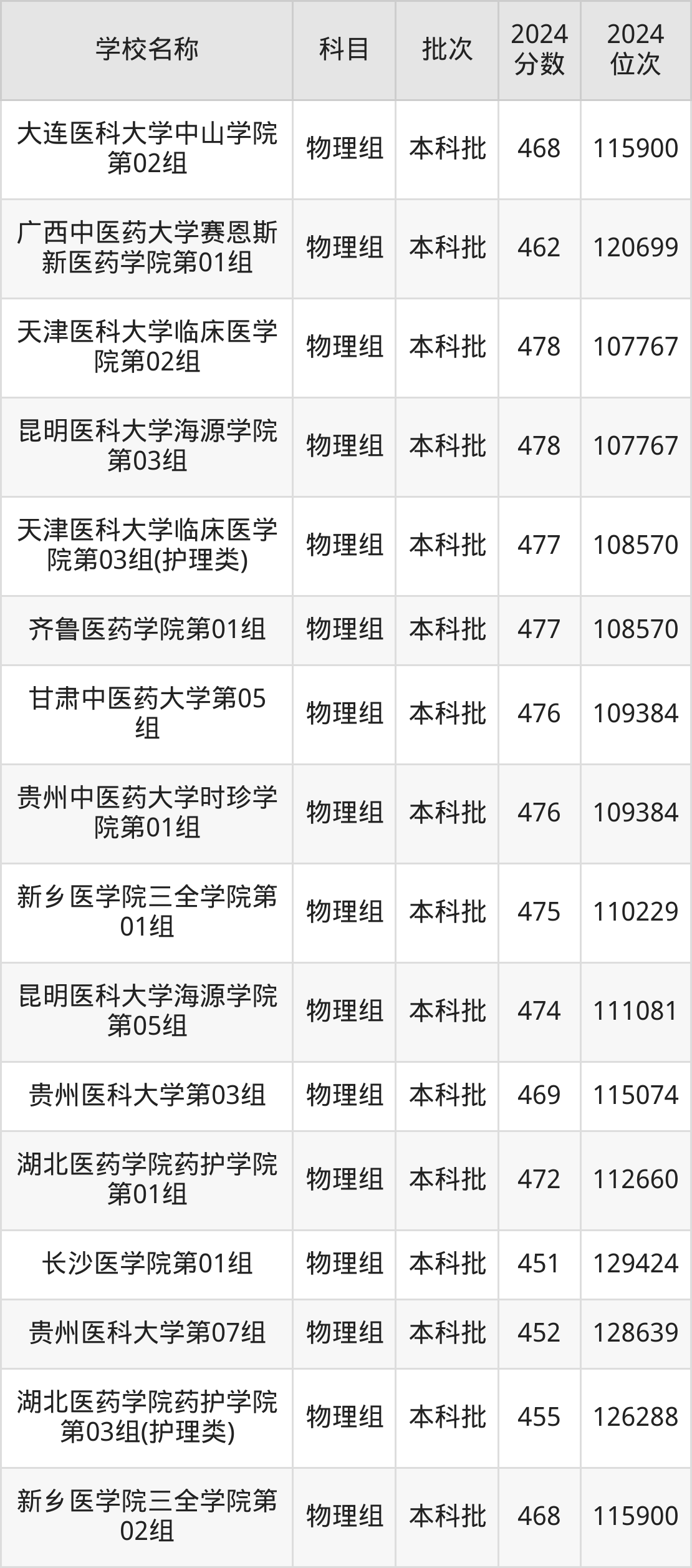 湖北高考物理组共有13所医科大学在450到480分之间录取,包含海南医科大学、天津医科大学临床医学院、昆明医科大学海源学院、齐鲁医药学院、甘肃中医药大学、贵州中医药大学时珍学院、新乡医学院三全学院、湖北医药学院药护学院、贵州医科大学、大连医科大学中山学院。