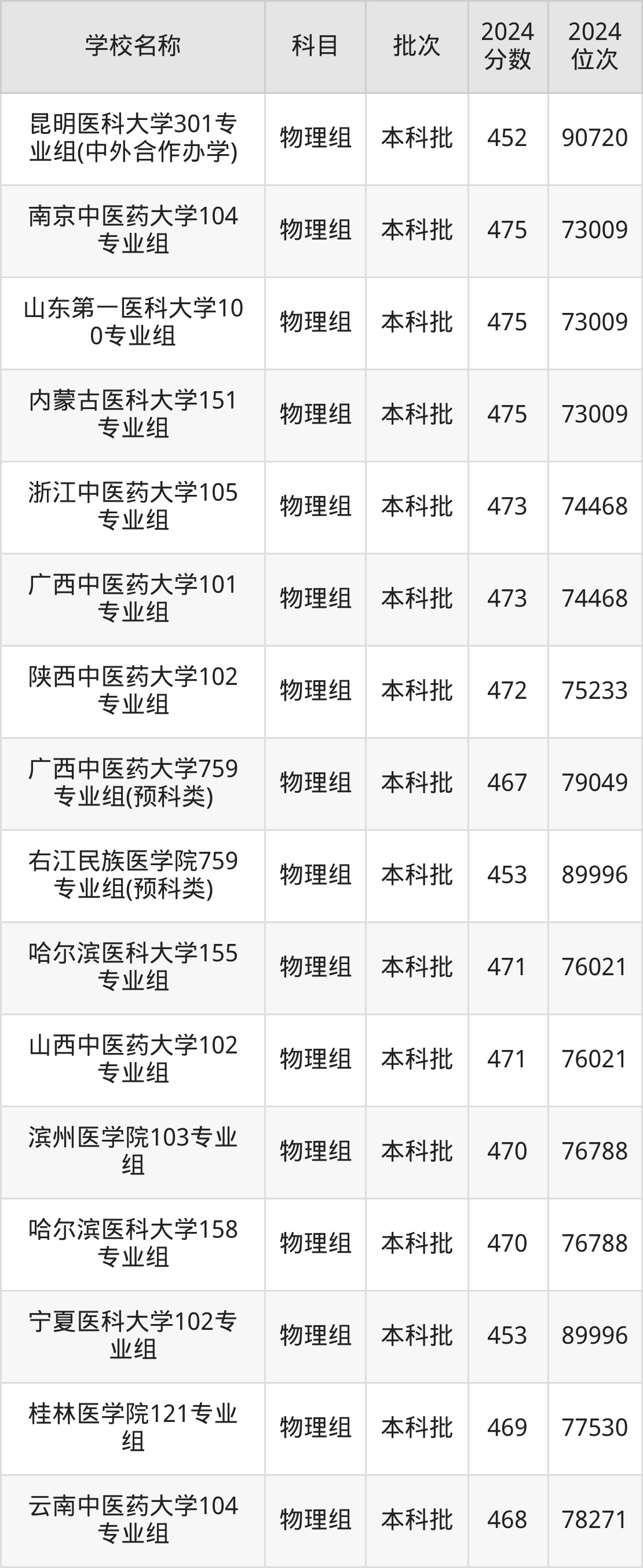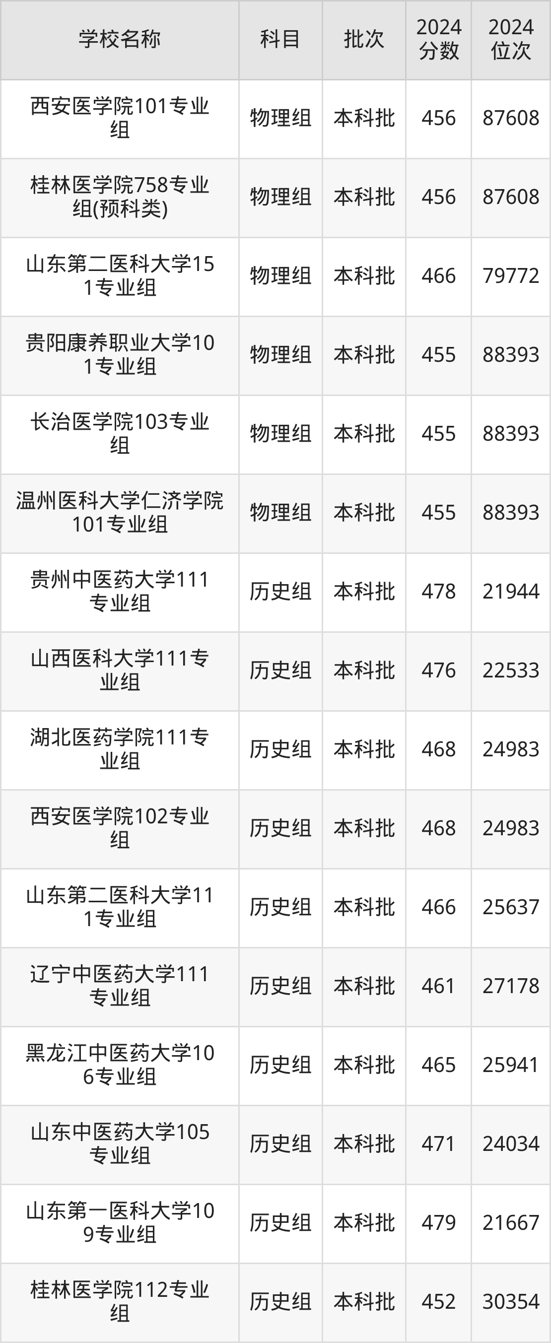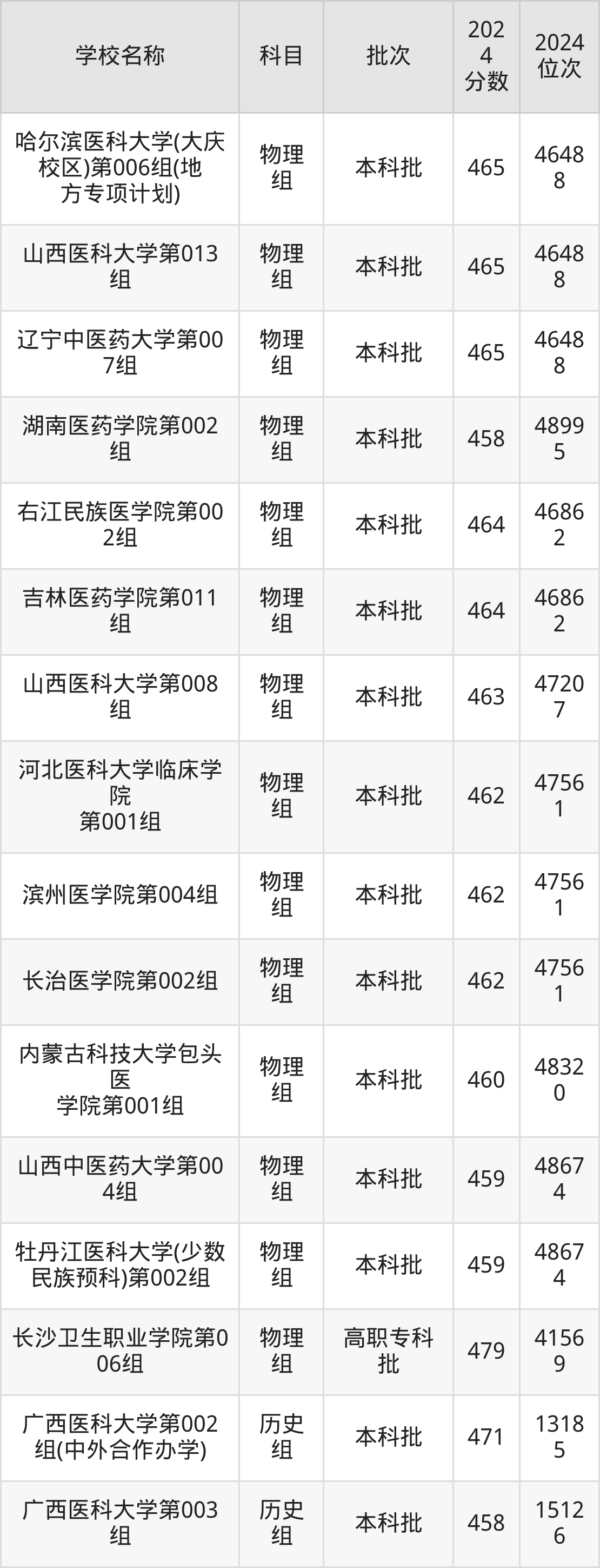 广西高考历史组共有13所医科大学在450到480分之间录取,包含海南医科大学、山东第一医科大学、长沙卫生职业学院、贵州中医药大学、山西医科大学、山东中医药大学、西安医学院、湖北医药学院、山东第二医科大学、黑龙江中医药大学。
