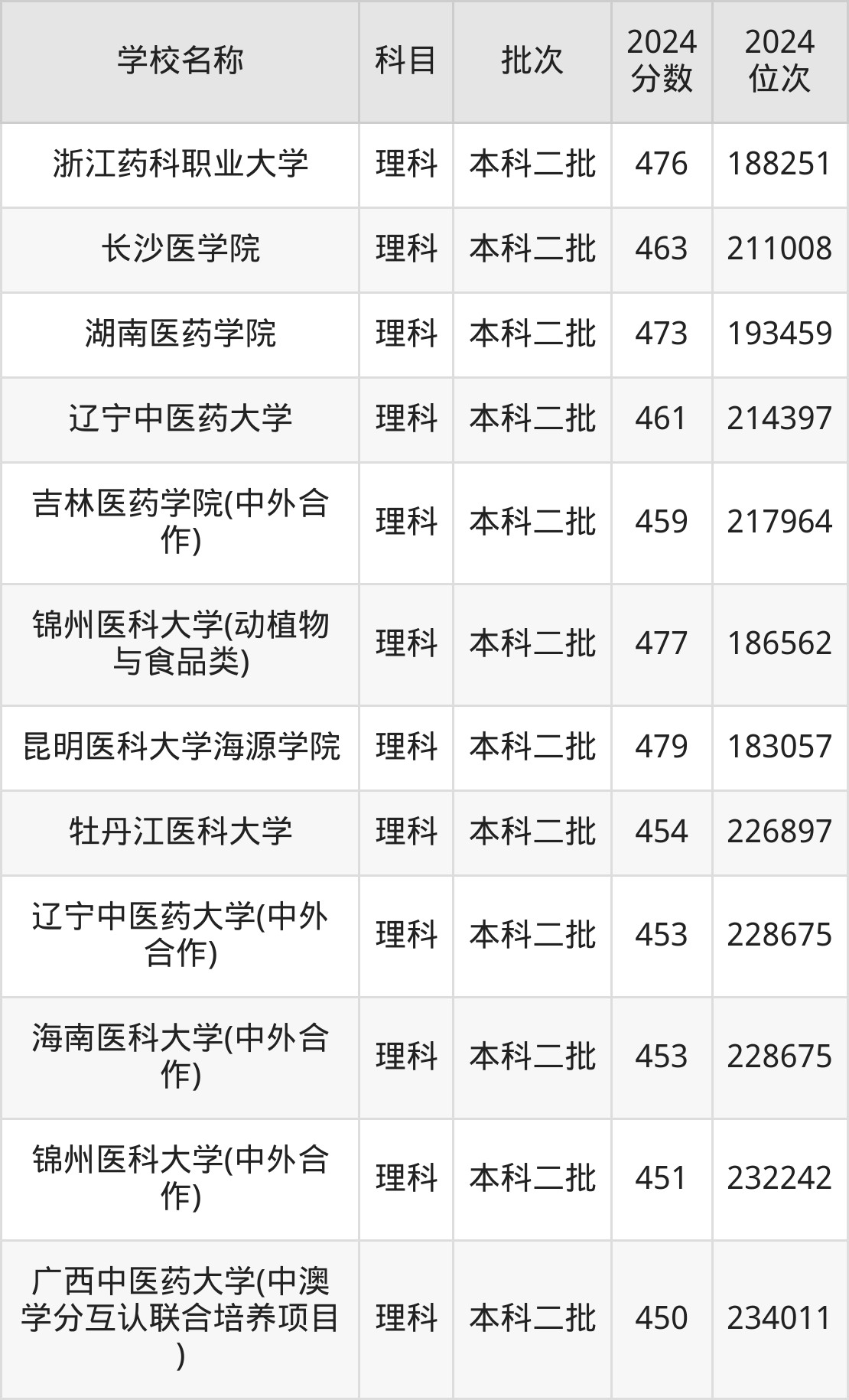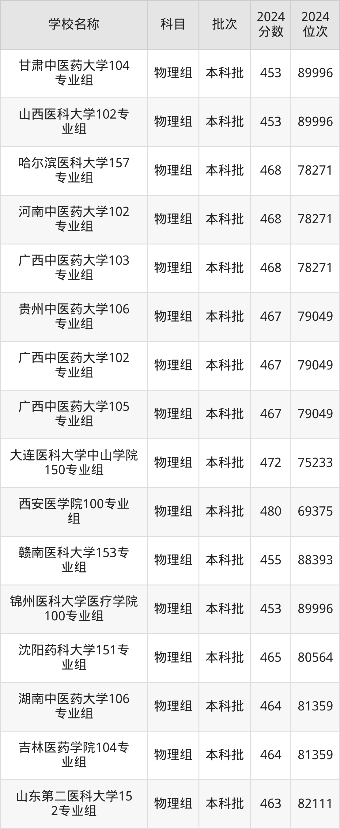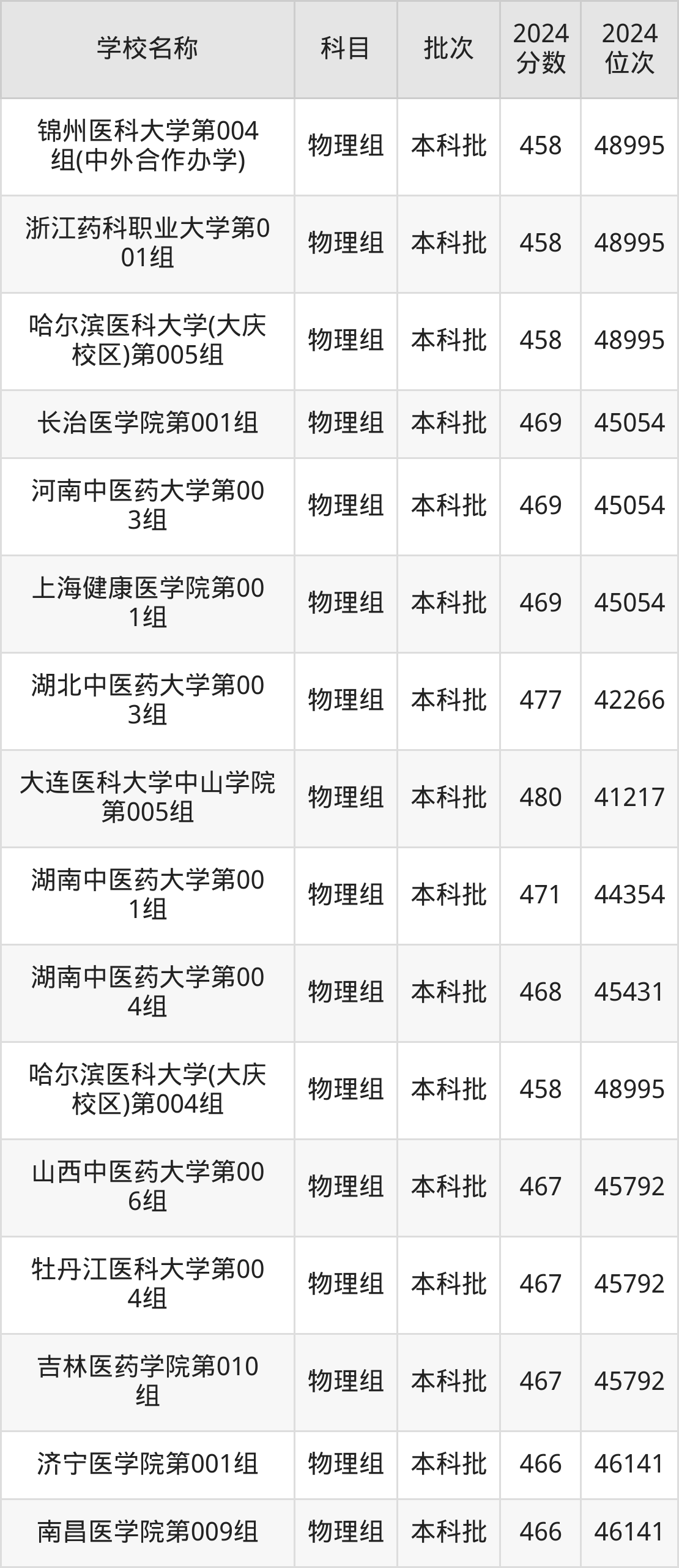 450到480分的医科大学有江西中医药大学、山西医科大学、哈尔滨医科大学(大庆校区)、黑龙江中医药大学、赣南医科大学、大庆医学高等专科学校、山西中医药大学、广西医科大学、天津中医药大学、吉林医药学院等。