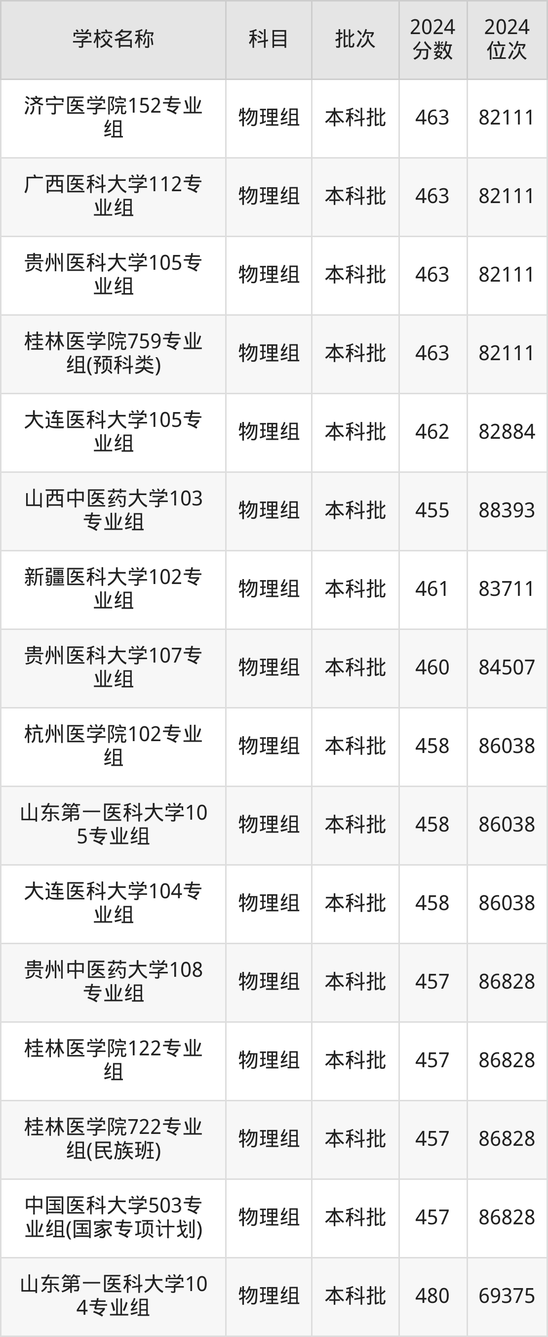 广西高考物理组共有44所医科大学在450到480分之间录取,包含山东第一医科大学、西安医学院、广西医科大学、湖南医药学院、辽宁中医药大学、遵义医科大学、新疆第二医学院、赣南医科大学、上海健康医学院、右江民族医学院。