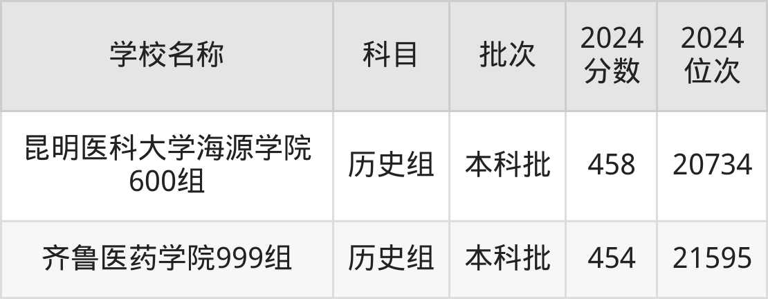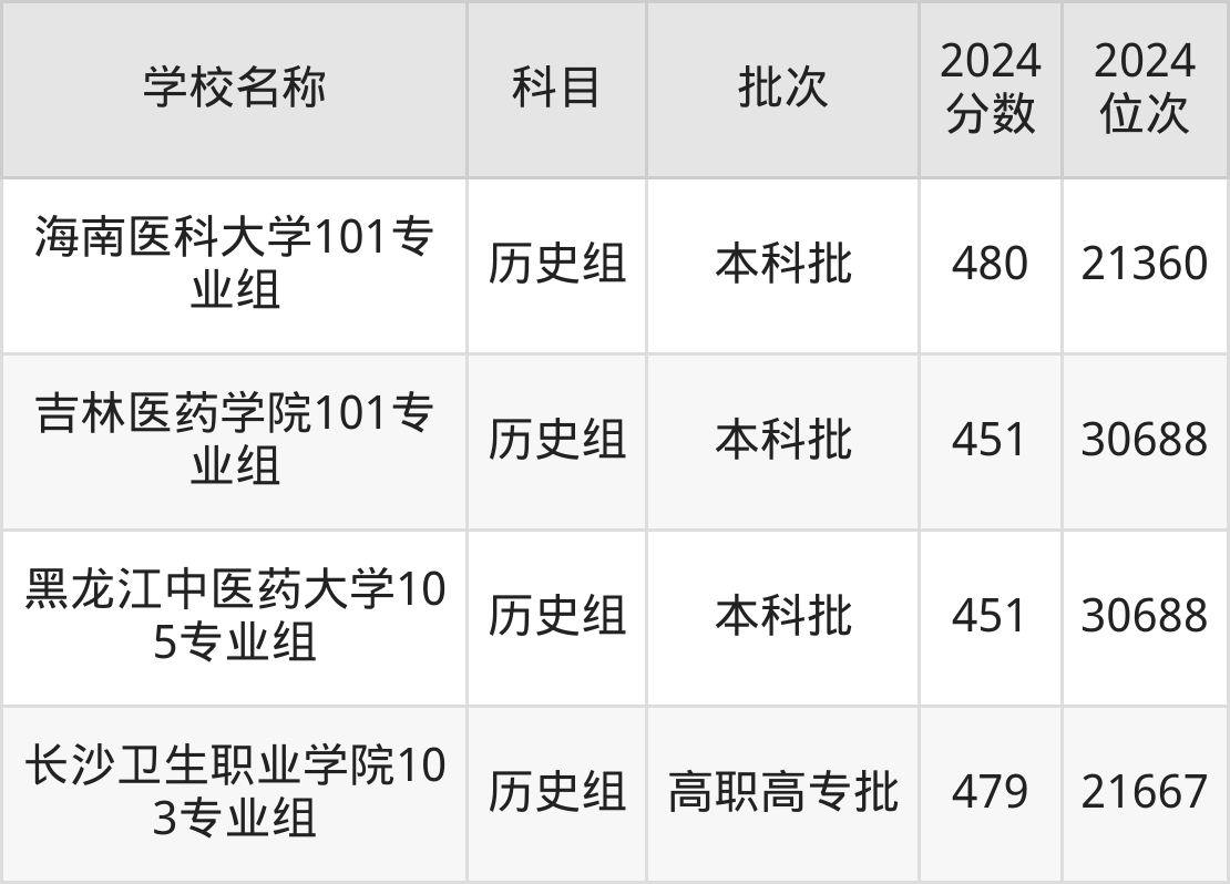 湖北高考历史组共有7所医科大学在450到480分之间录取,包含河北医科大学临床学院、浙江中医药大学、重庆医药高等专科学校、昆明医科大学海源学院、长春医学高等专科学校、大连医科大学中山学院、湖南中医药大学湘杏学院。