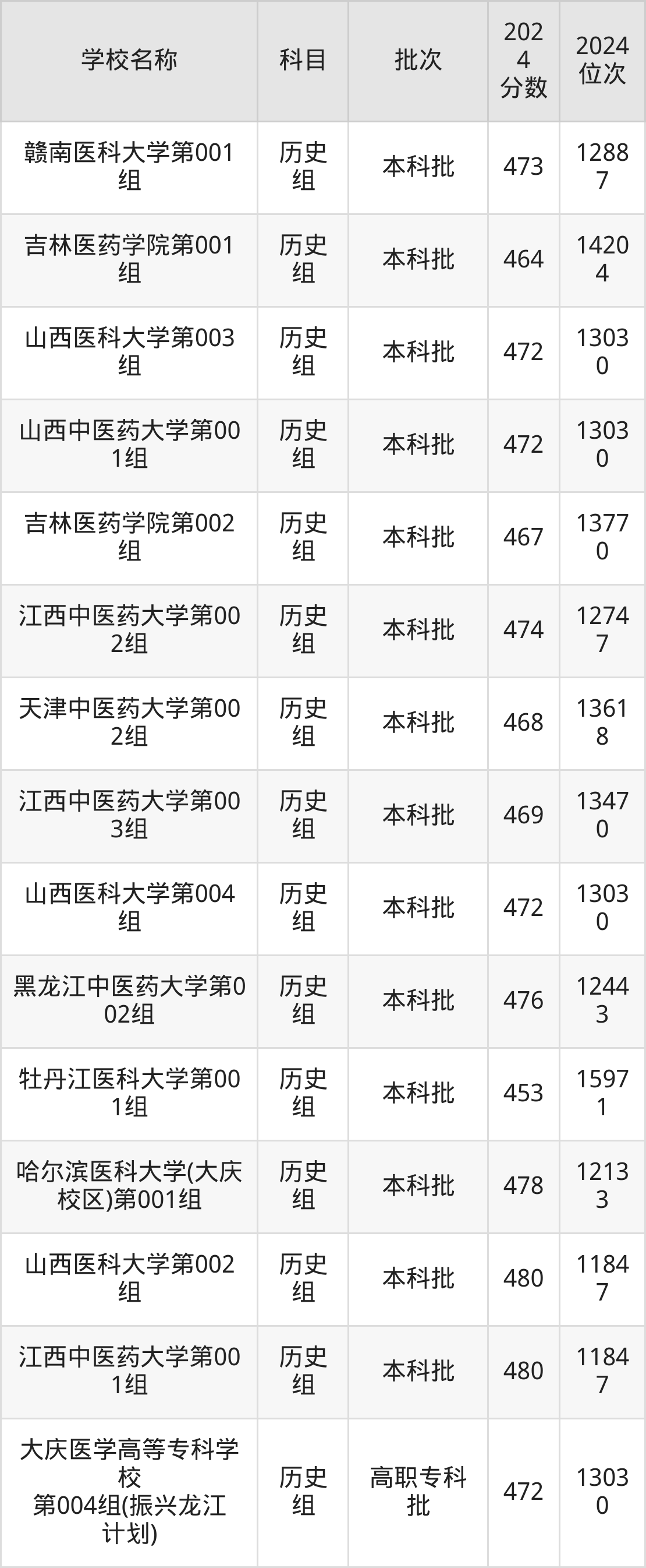 黑龙江高考历史组共有11所医科大学在450到480分之间录取,包含江西中医药大学、山西医科大学、哈尔滨医科大学(大庆校区)、黑龙江中医药大学、赣南医科大学、大庆医学高等专科学校、山西中医药大学、广西医科大学、天津中医药大学、吉林医药学院。