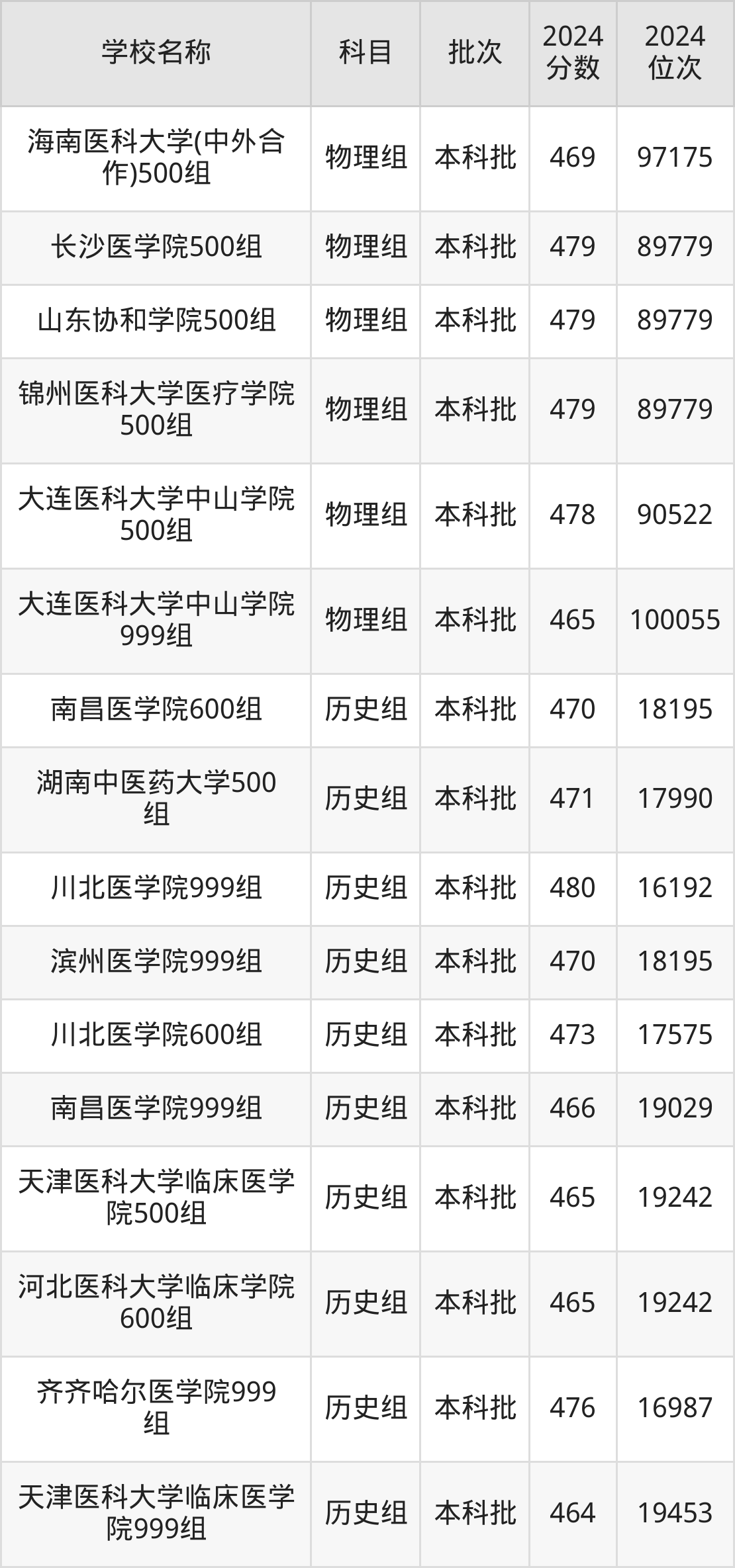 福建高考历史组共有9所医科大学在450到480分之间录取,包含川北医学院、齐齐哈尔医学院、湖南中医药大学、南昌医学院、滨州医学院、天津医科大学临床医学院、河北医科大学临床学院、昆明医科大学海源学院、齐鲁医药学院。
