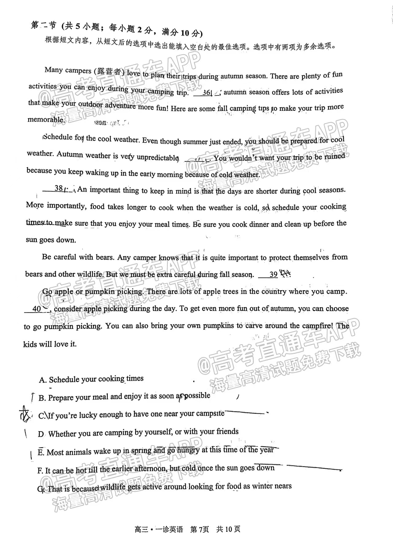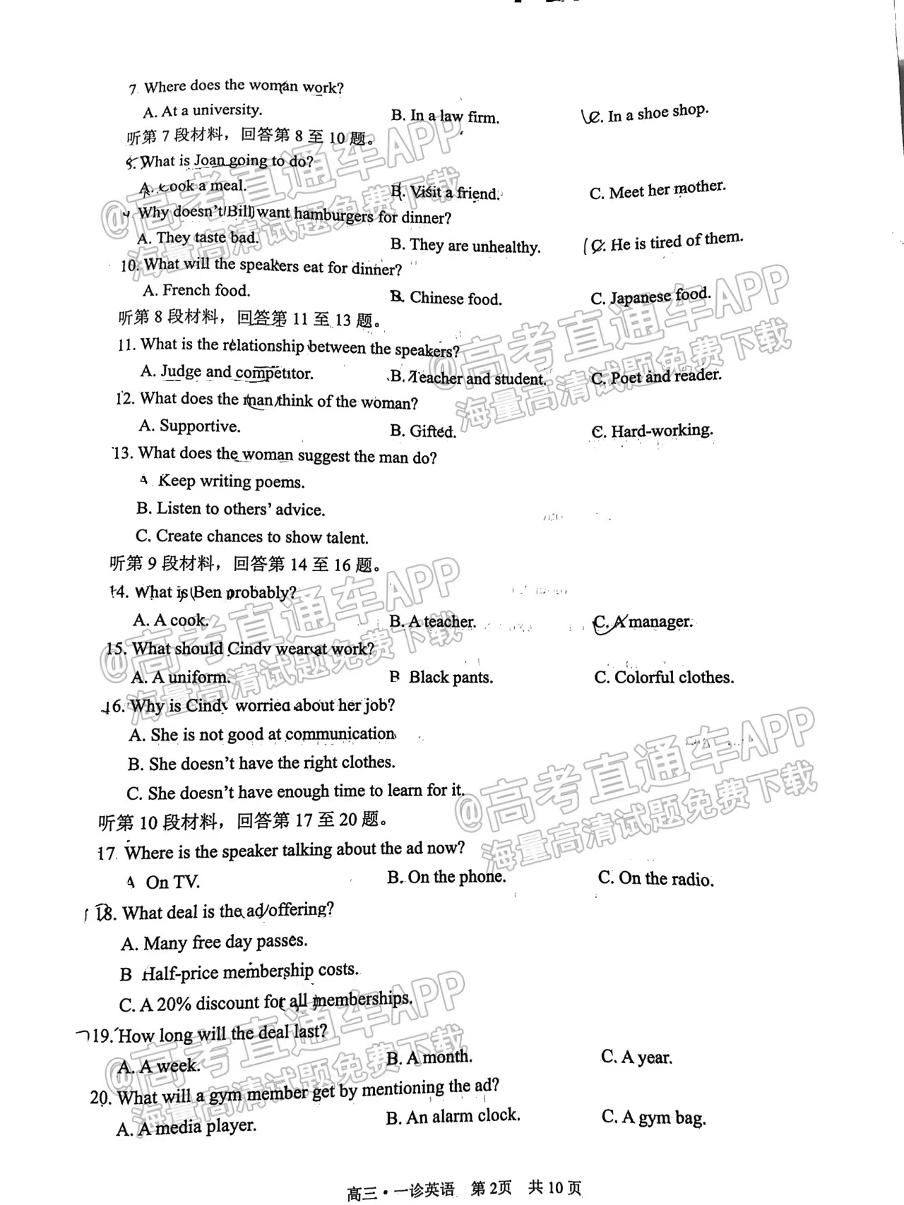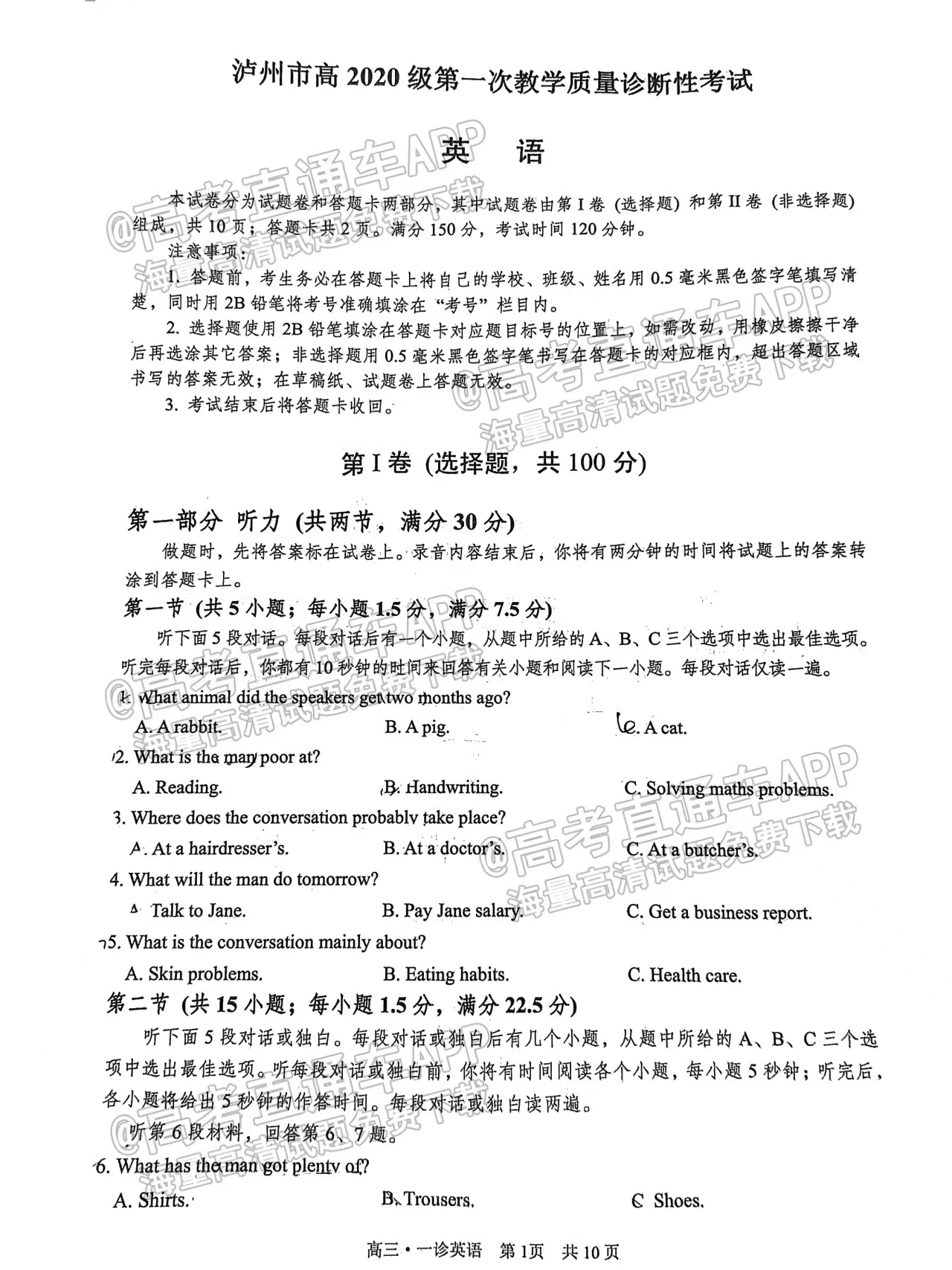 2023泸州一诊考试将于2022年11月22日开考,考试结束后高考100网将更新泸州一诊考试英语答案及试卷,下文为高考100网小编搜集整理的2023泸州第一次诊断性考试英语试题及参考答案,供大家参考。
