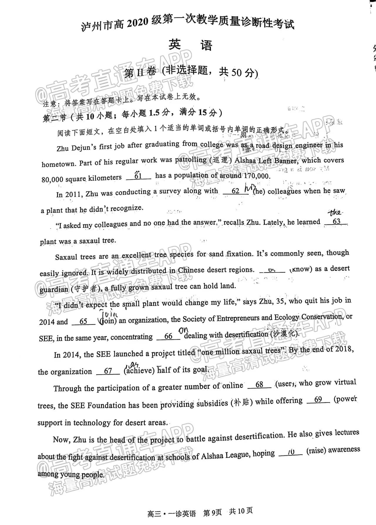 本次考试其他各科试题及参考答案汇总:2023泸州一诊各科试题及参考答案汇总(点击查看)