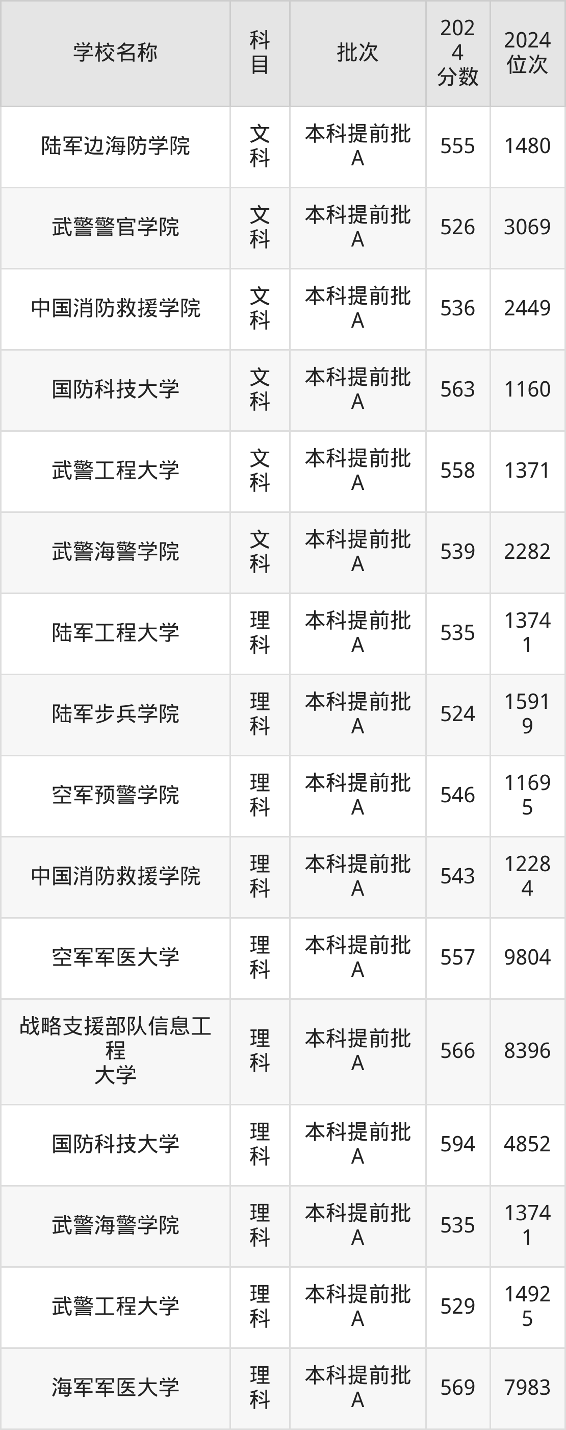 内蒙古高考文科共有6所军校在500到600分之间录取,包含国防科技大学、武警工程大学、陆军边海防学院、武警海警学院、中国消防救援学院、武警警官学院。
