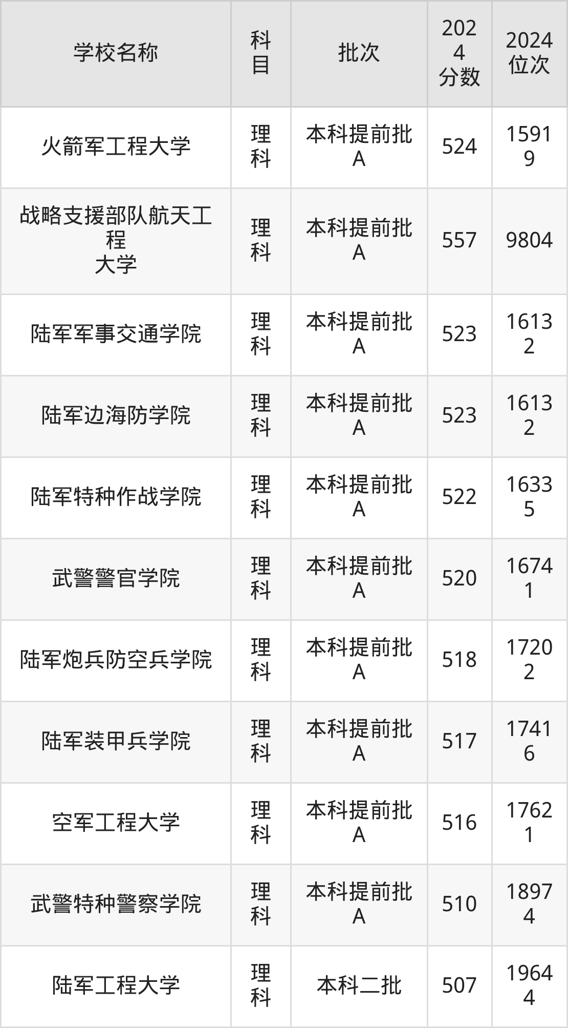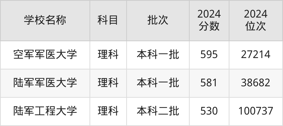 河南高考理科共有3所军校在500到600分之间录取,包含空军军医大学、陆军军医大学、陆军工程大学。