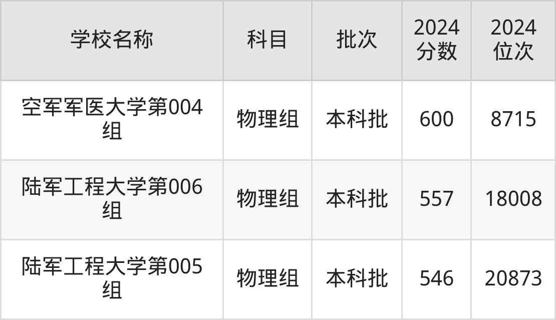 黑龙江高考物理组共有2所军校在500到600分之间录取,包含空军军医大学、陆军工程大学。