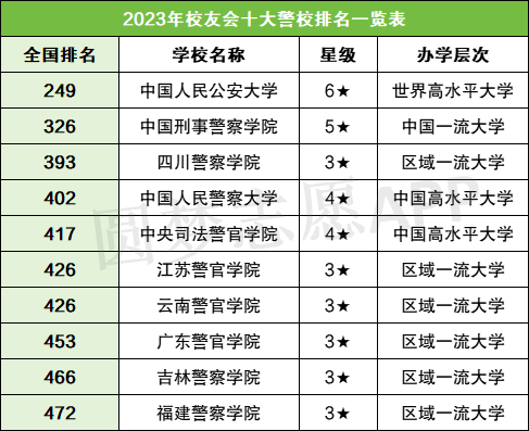 在2023年的校友会大学排名中,位列前十的警校分别是中国人民公安大学(第249名)、中国刑事警察学院(第326名)、四川警察学院(第393名)、中国人民警察大学(第402名)、中央司法警官学院(第417名)、江苏警官学院(第426名)、云南警官学院(第426名)、广东警官学院(第453名)、吉林警察学院(第466名)、福建警察学院(第472名)。