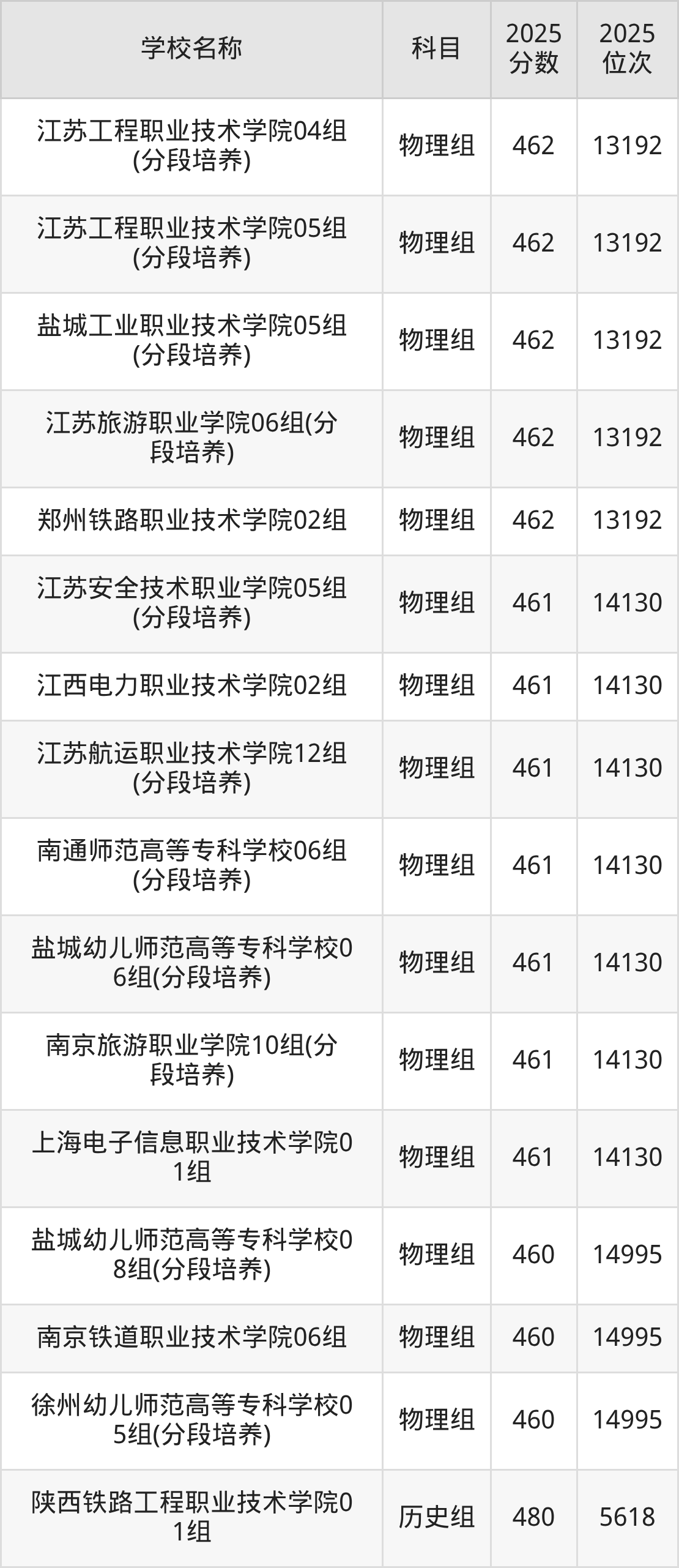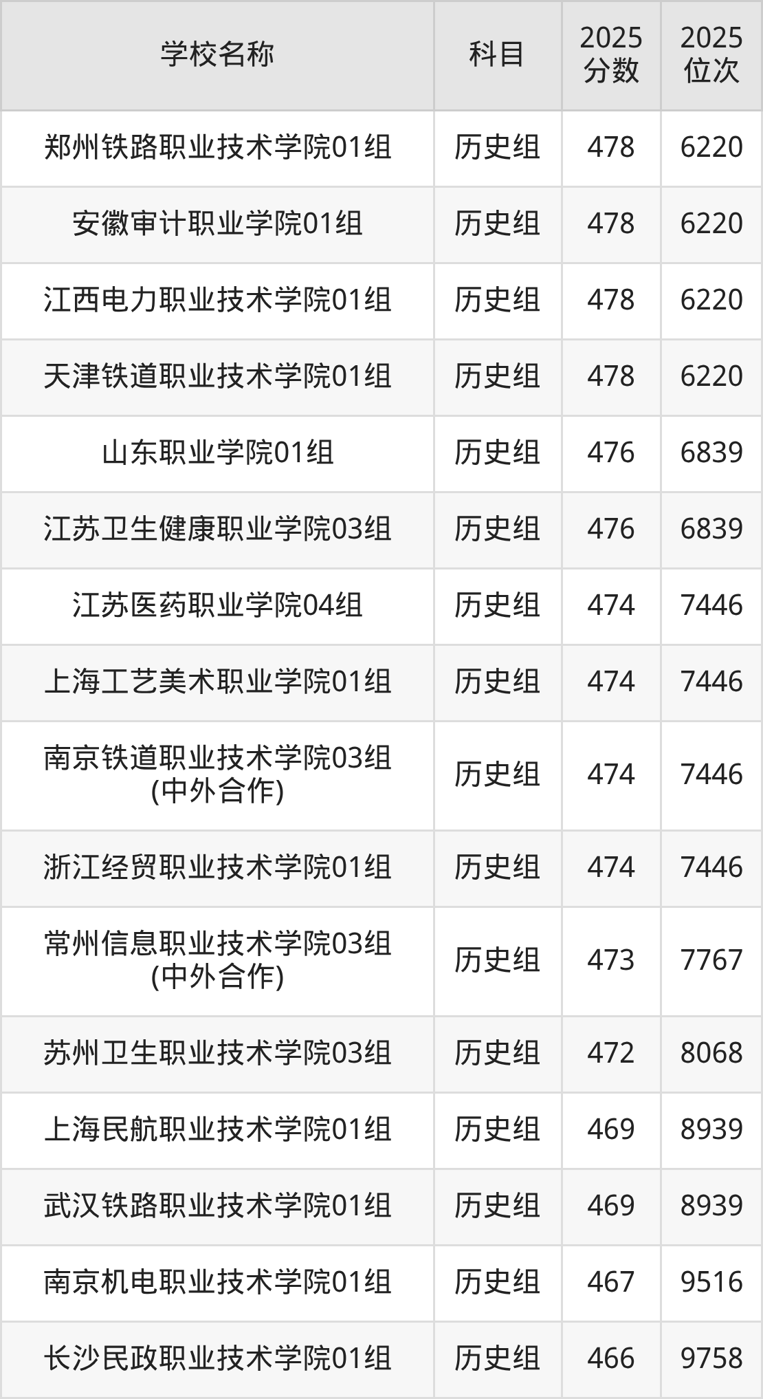 江苏高考历史组共有27所公办专科学校在460到480分之间录取,包含陕西铁路工程职业技术学院、安徽审计职业学院、江西电力职业技术学院、天津铁道职业技术学院、郑州铁路职业技术学院、江苏卫生健康职业学院、山东职业学院、南京铁道职业技术学院、江苏医药职业学院、上海工艺美术职业学院。