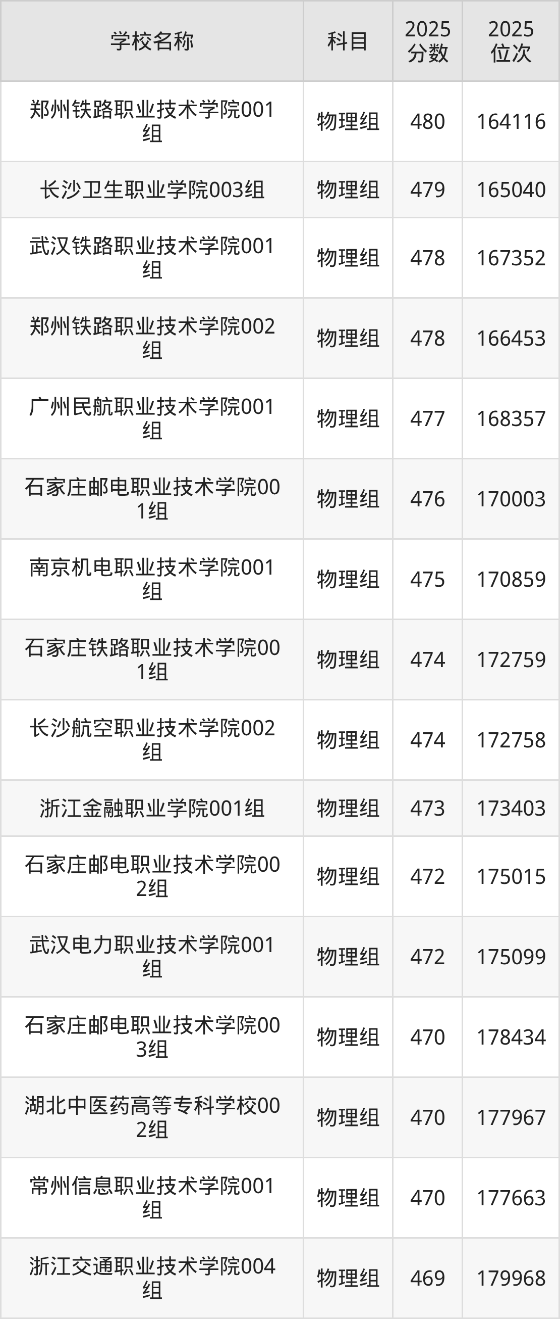 安徽高考物理组共有25所公办专科学校在460到480分之间录取,包含郑州铁路职业技术学院、长沙卫生职业学院、武汉铁路职业技术学院、广州民航职业技术学院、石家庄邮电职业技术学院、南京机电职业技术学院、长沙航空职业技术学院、石家庄铁路职业技术学院、浙江金融职业学院、武汉电力职业技术学院。