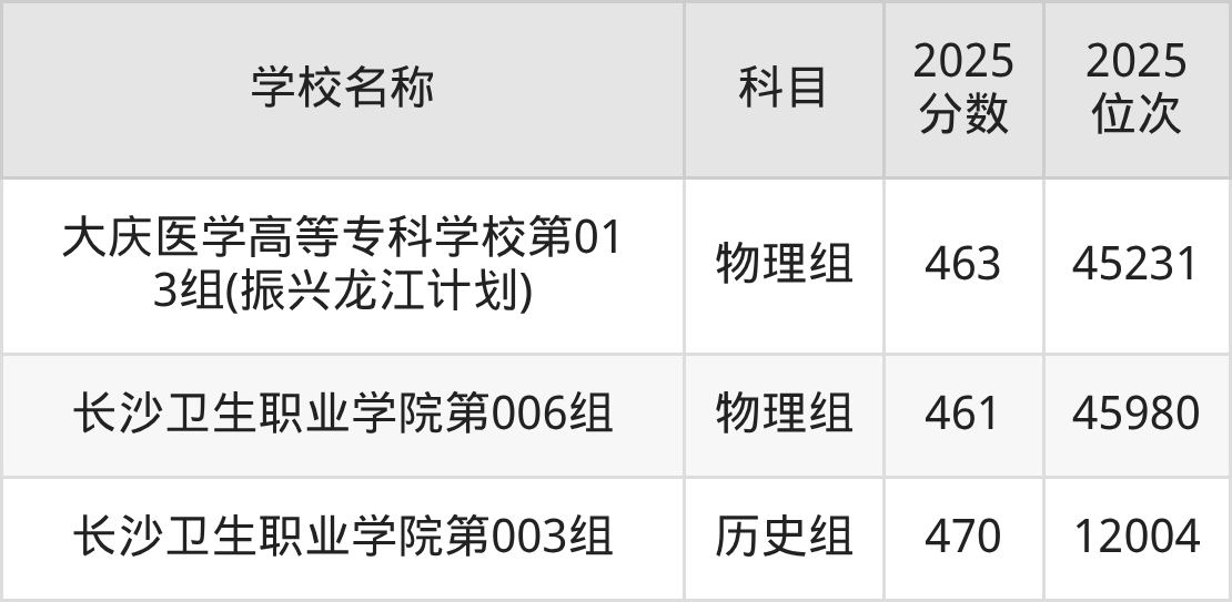 黑龙江高考物理组共有2所公办专科学校在460到480分之间录取,包含大庆医学高等专科学校、长沙卫生职业学院。