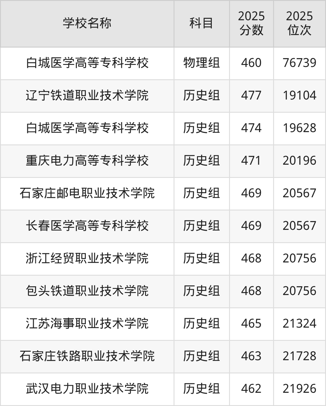 辽宁高考历史组共有10所公办专科学校在460到480分之间录取,包含辽宁铁道职业技术学院、白城医学高等专科学校、重庆电力高等专科学校、石家庄邮电职业技术学院、长春医学高等专科学校、浙江经贸职业技术学院、包头铁道职业技术学院、江苏海事职业技术学院、石家庄铁路职业技术学院、武汉电力职业技术学院。