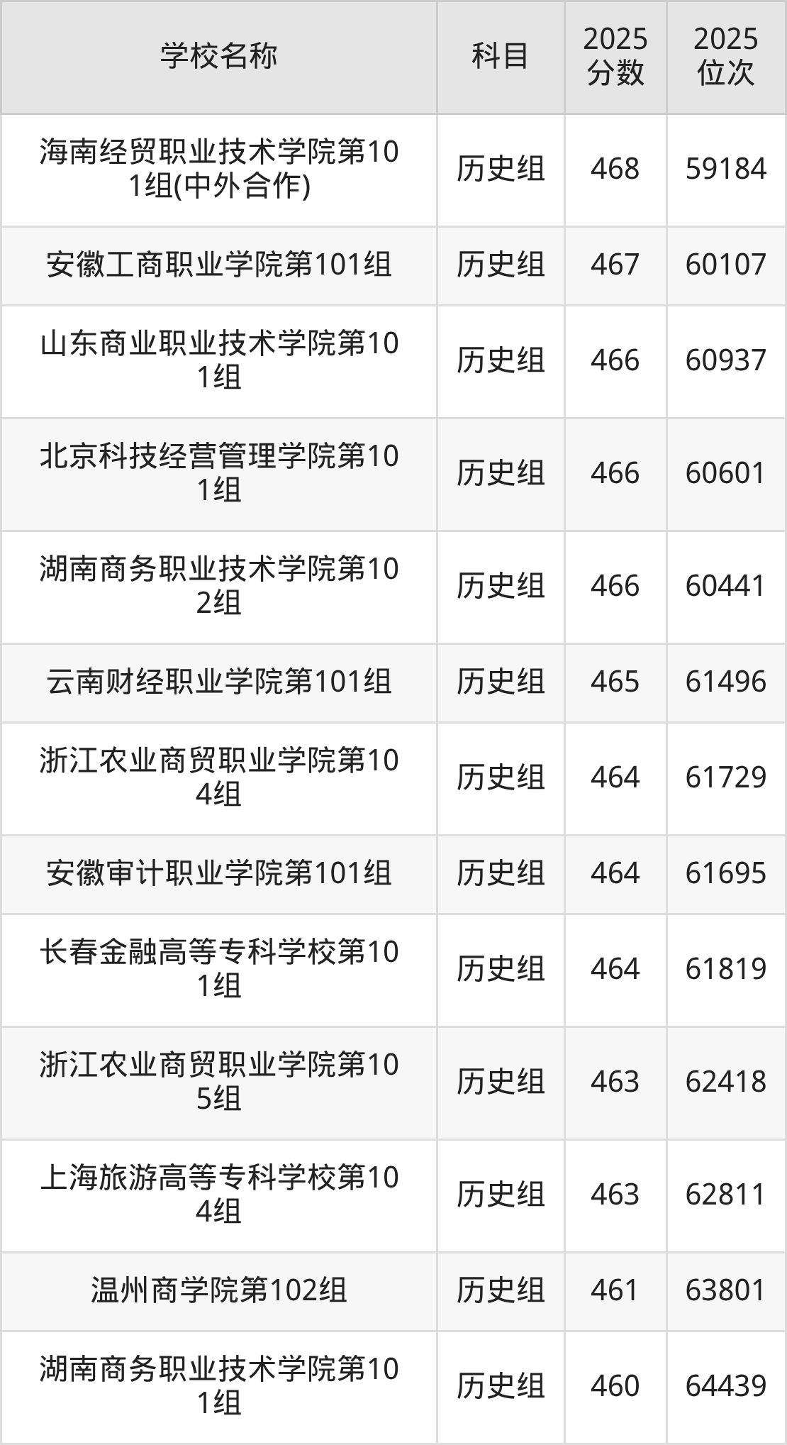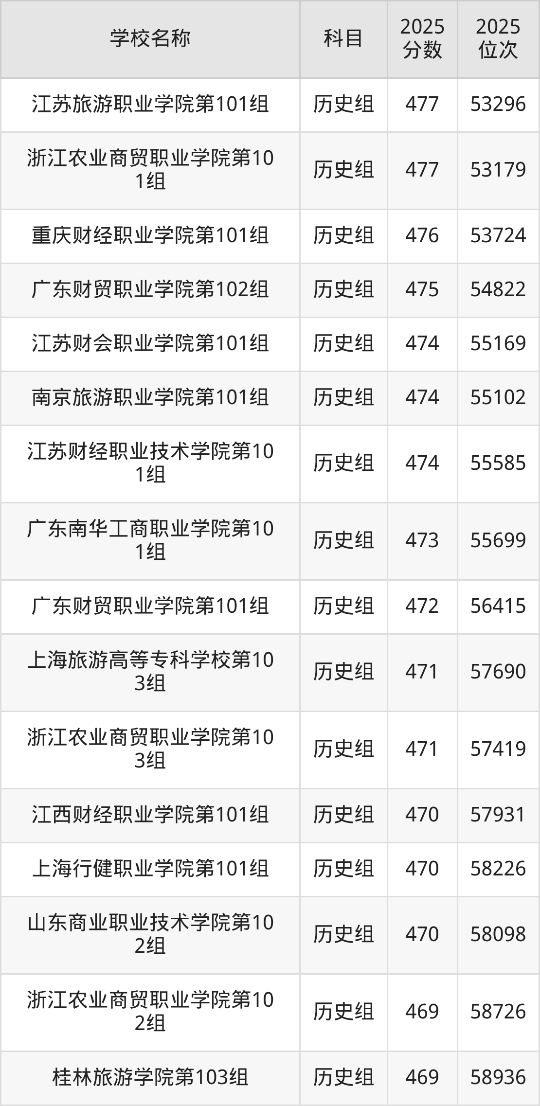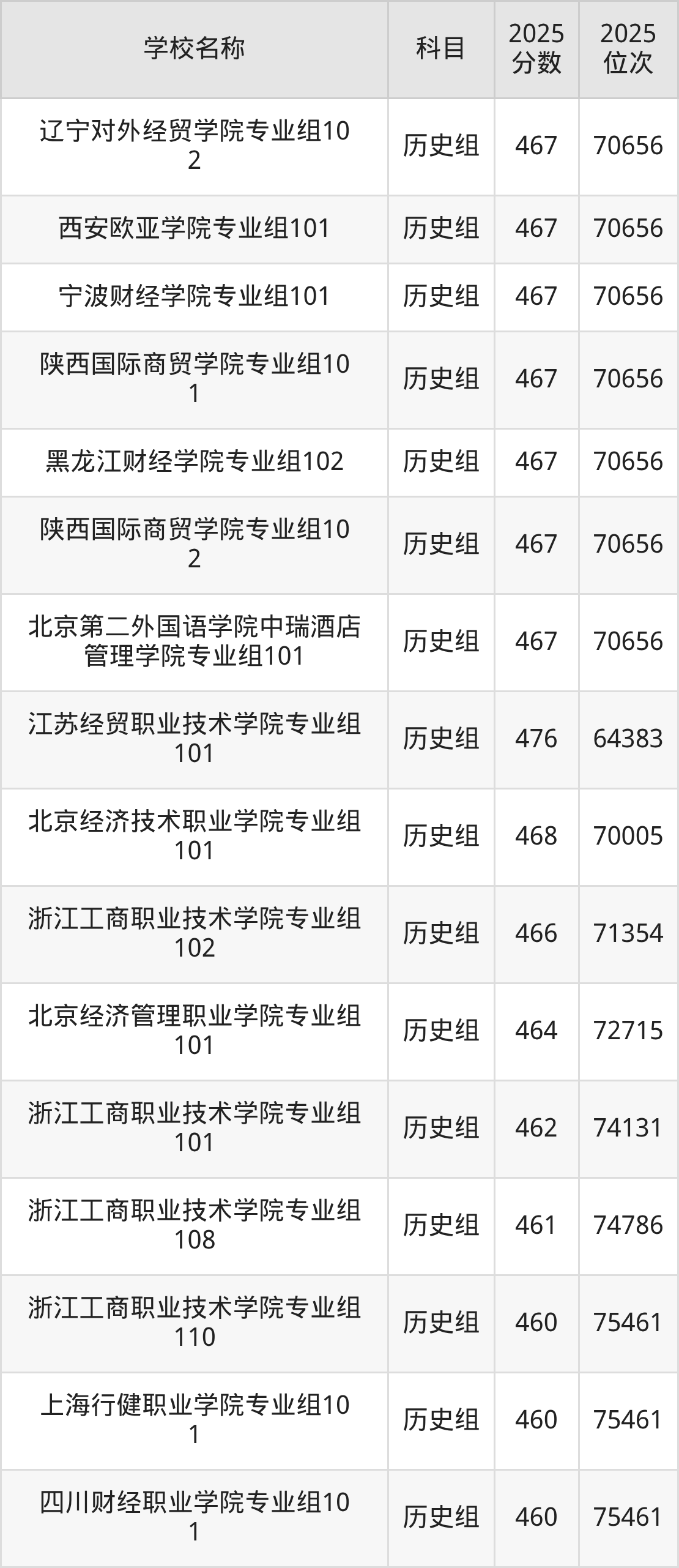 江西高考历史组共有21所财经大学在460到480分之间录取,包含山东商业职业技术学院、上海旅游高等专科学校、江苏旅游职业学院、浙江农业商贸职业学院、重庆财经职业学院、广东财贸职业学院、江苏财经职业技术学院、南京旅游职业学院、江苏财会职业学院、广东南华工商职业学院。