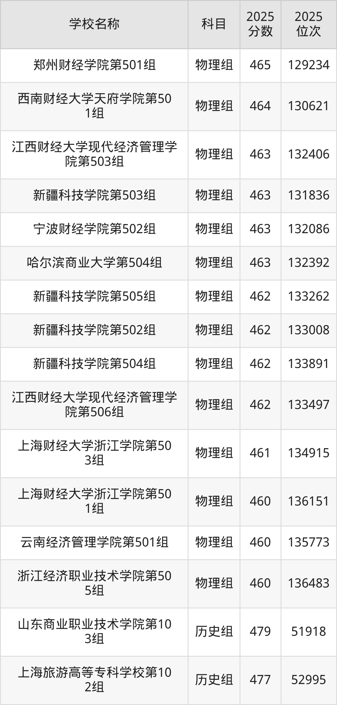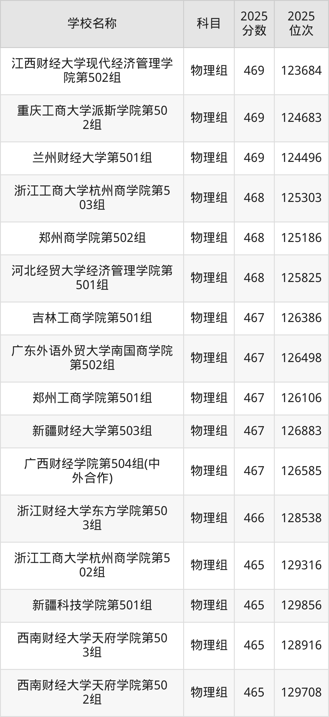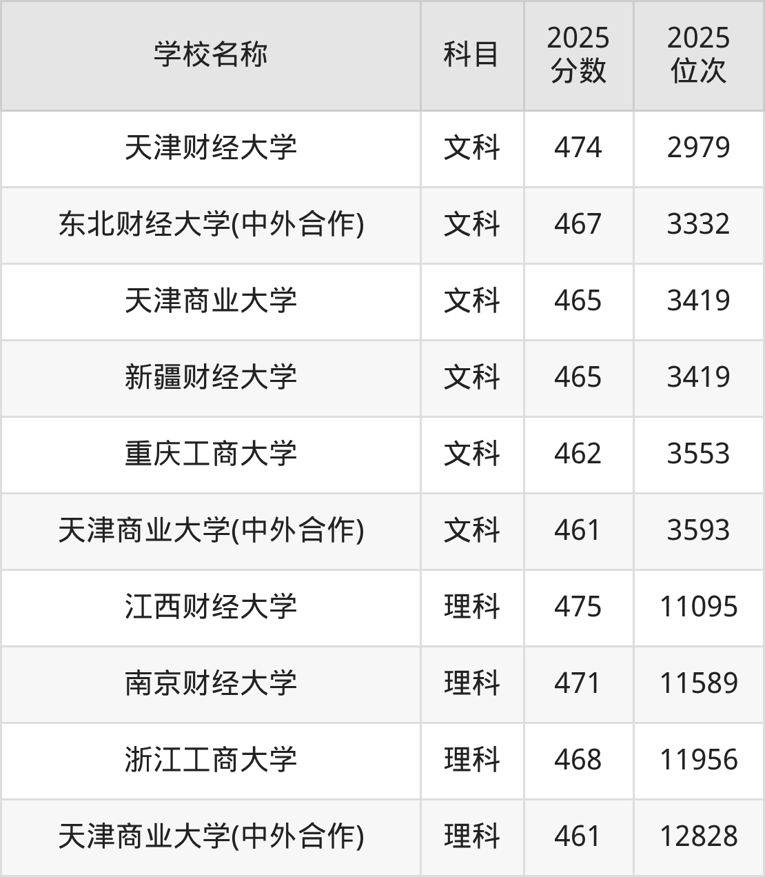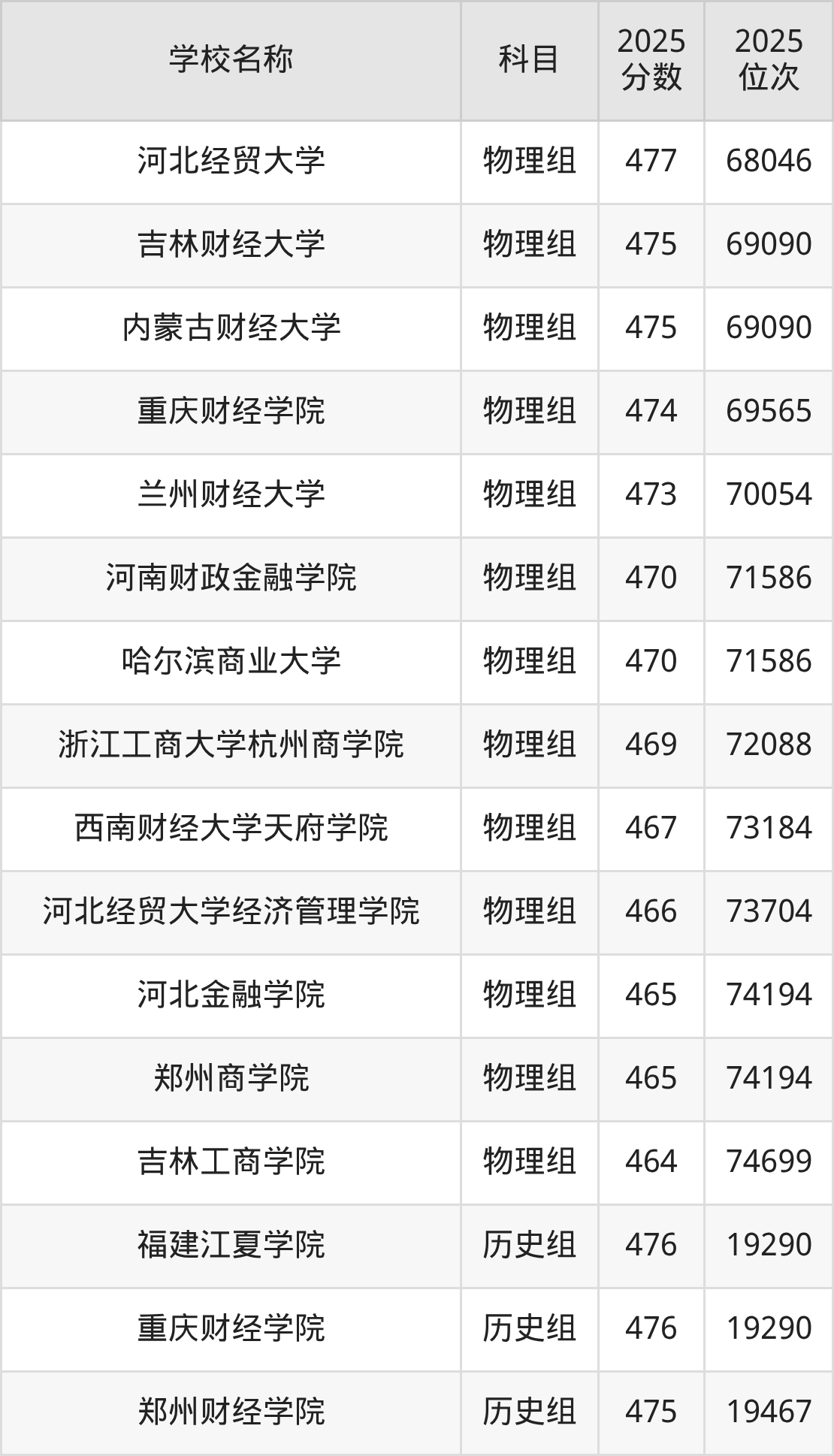 新疆高考理科共有4所财经大学在460到480分之间录取,包含江西财经大学、南京财经大学、浙江工商大学、天津商业大学(中外合作)。