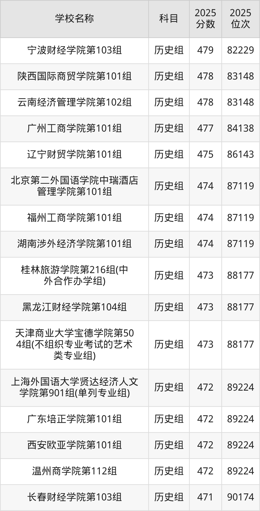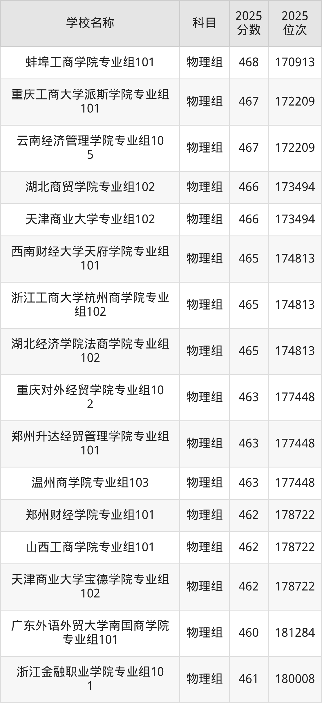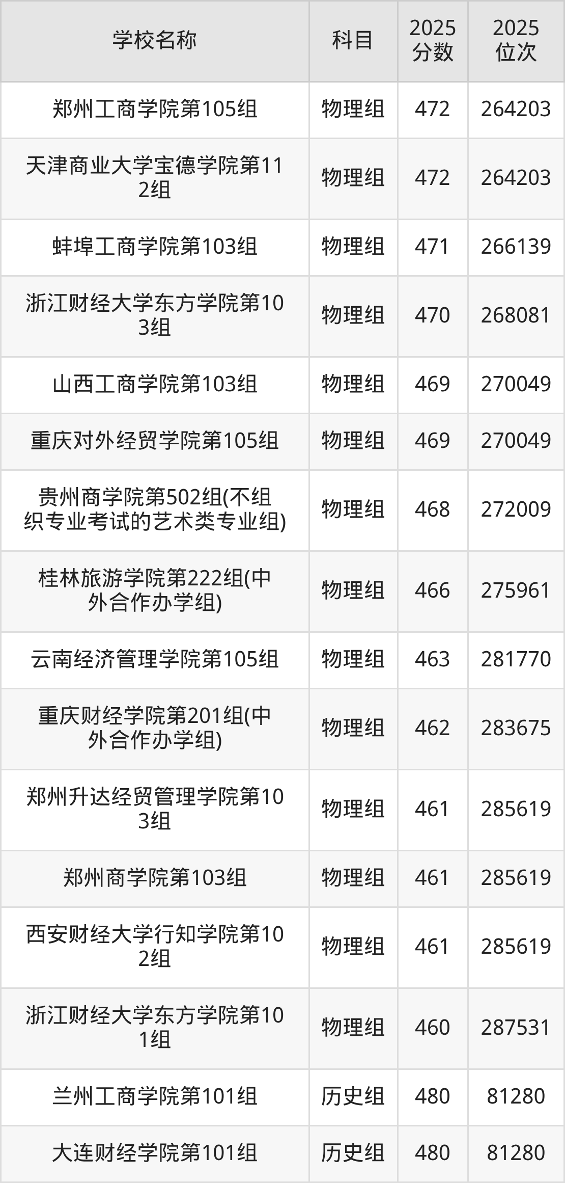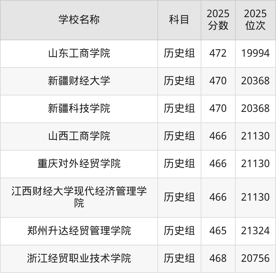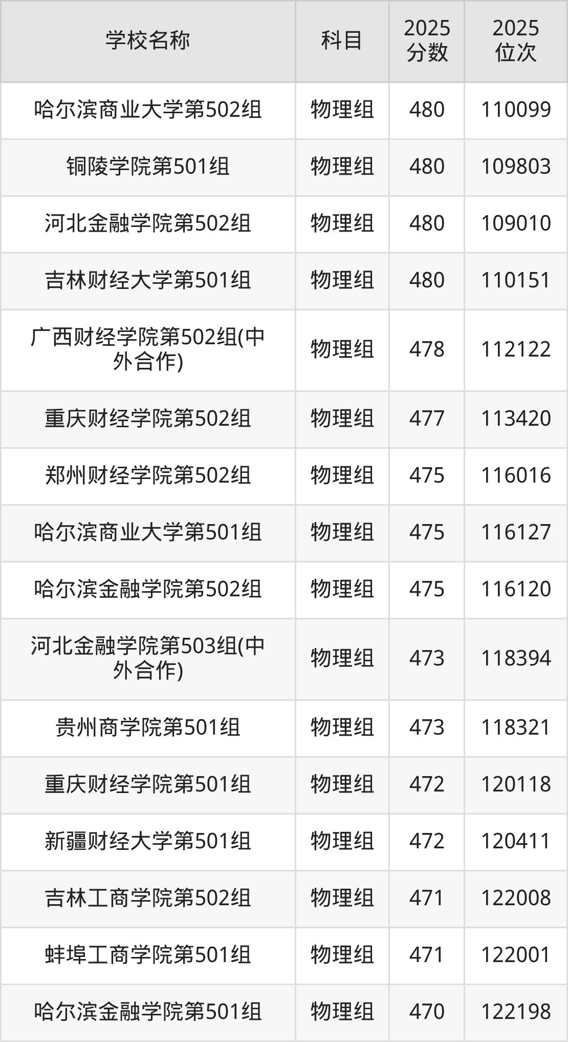 新疆高考理科共有4所财经大学在460到480分之间录取,包含江西财经大学、南京财经大学、浙江工商大学、天津商业大学(中外合作)。