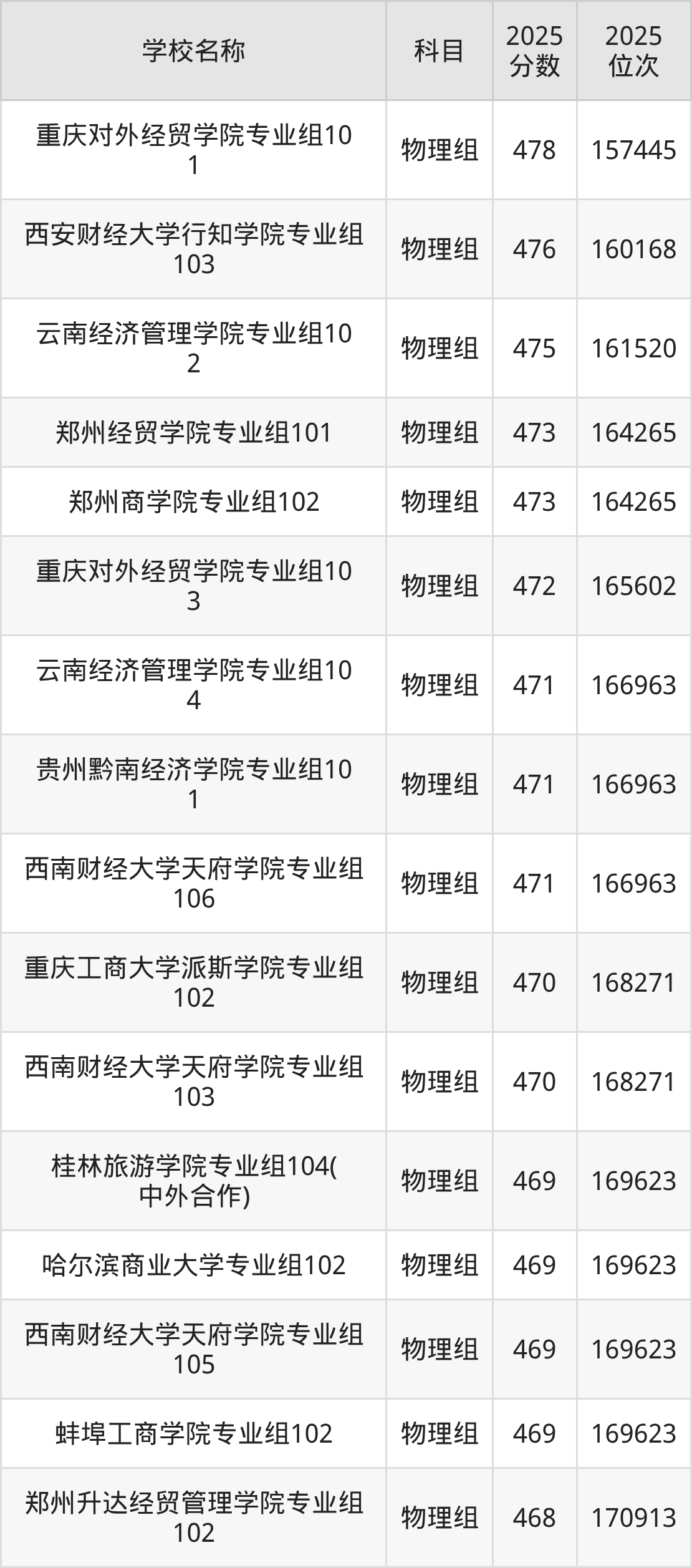 四川高考物理组共有22所财经大学在460到480分之间录取,包含重庆对外经贸学院、西安财经大学行知学院、云南经济管理学院、郑州经贸学院、郑州商学院、西南财经大学天府学院、贵州黔南经济学院、重庆工商大学派斯学院、蚌埠工商学院、桂林旅游学院。