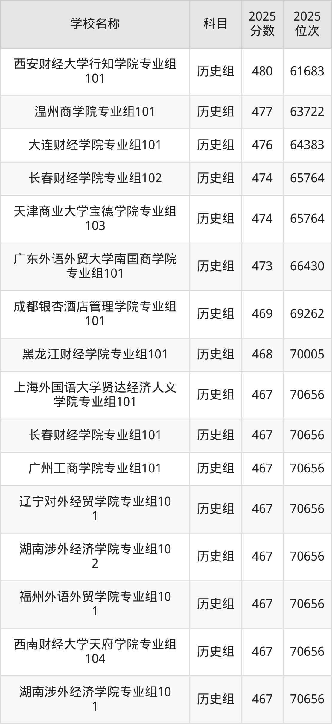 辽宁高考历史组共有11所财经大学在460到480分之间录取,包含福建江夏学院、重庆财经学院、郑州财经学院、山东工商学院、新疆科技学院、新疆财经大学、浙江经贸职业技术学院、山西工商学院、江西财经大学现代经济管理学院、重庆对外经贸学院。