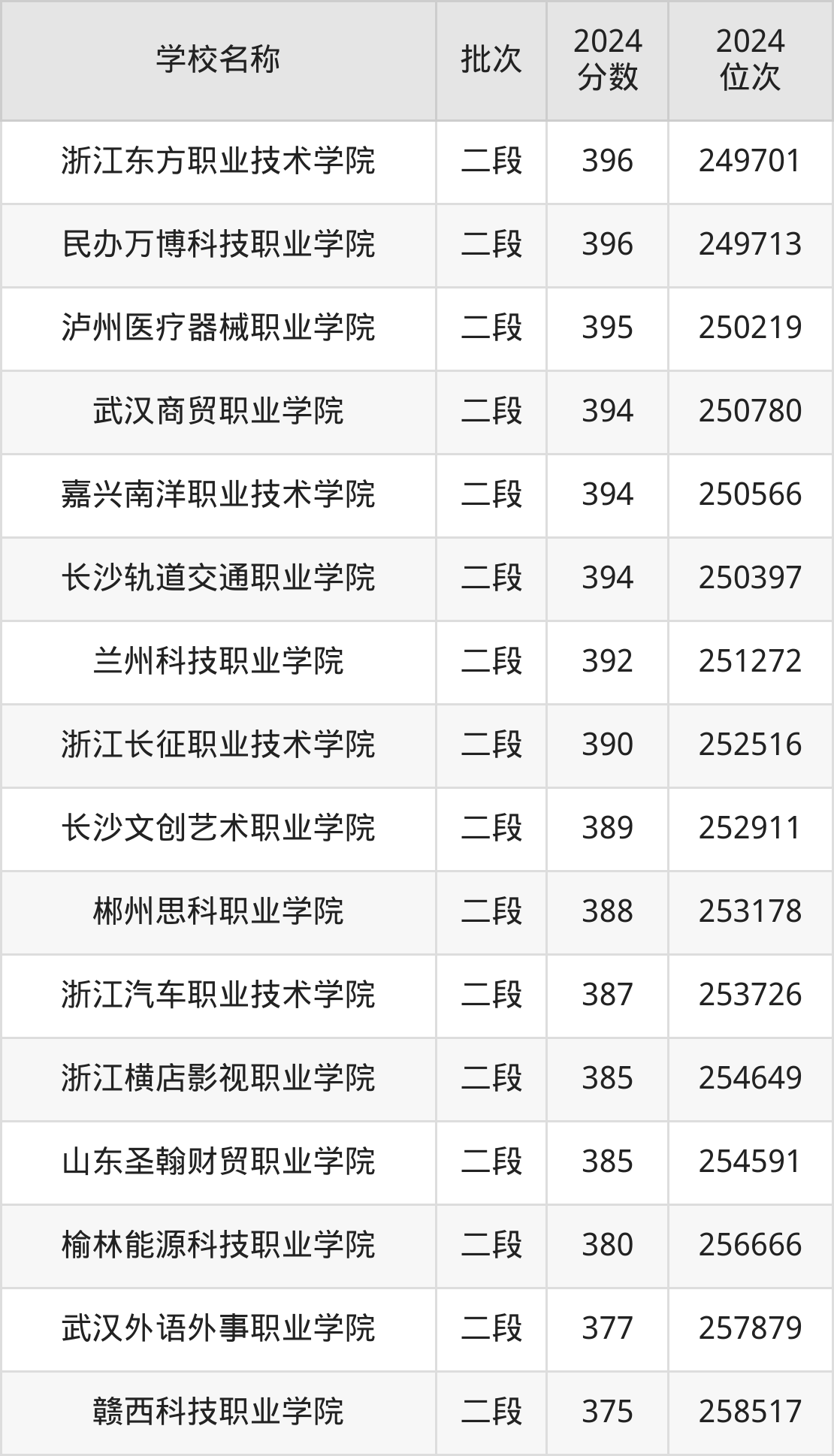 浙江高考共有48所民办专科学校在350到400分之间录取,包含浙江东方职业技术学院、民办万博科技职业学院、泸州医疗器械职业学院、武汉商贸职业学院、嘉兴南洋职业技术学院、长沙轨道交通职业学院、兰州科技职业学院、浙江长征职业技术学院、长沙文创艺术职业学院、郴州思科职业学院。