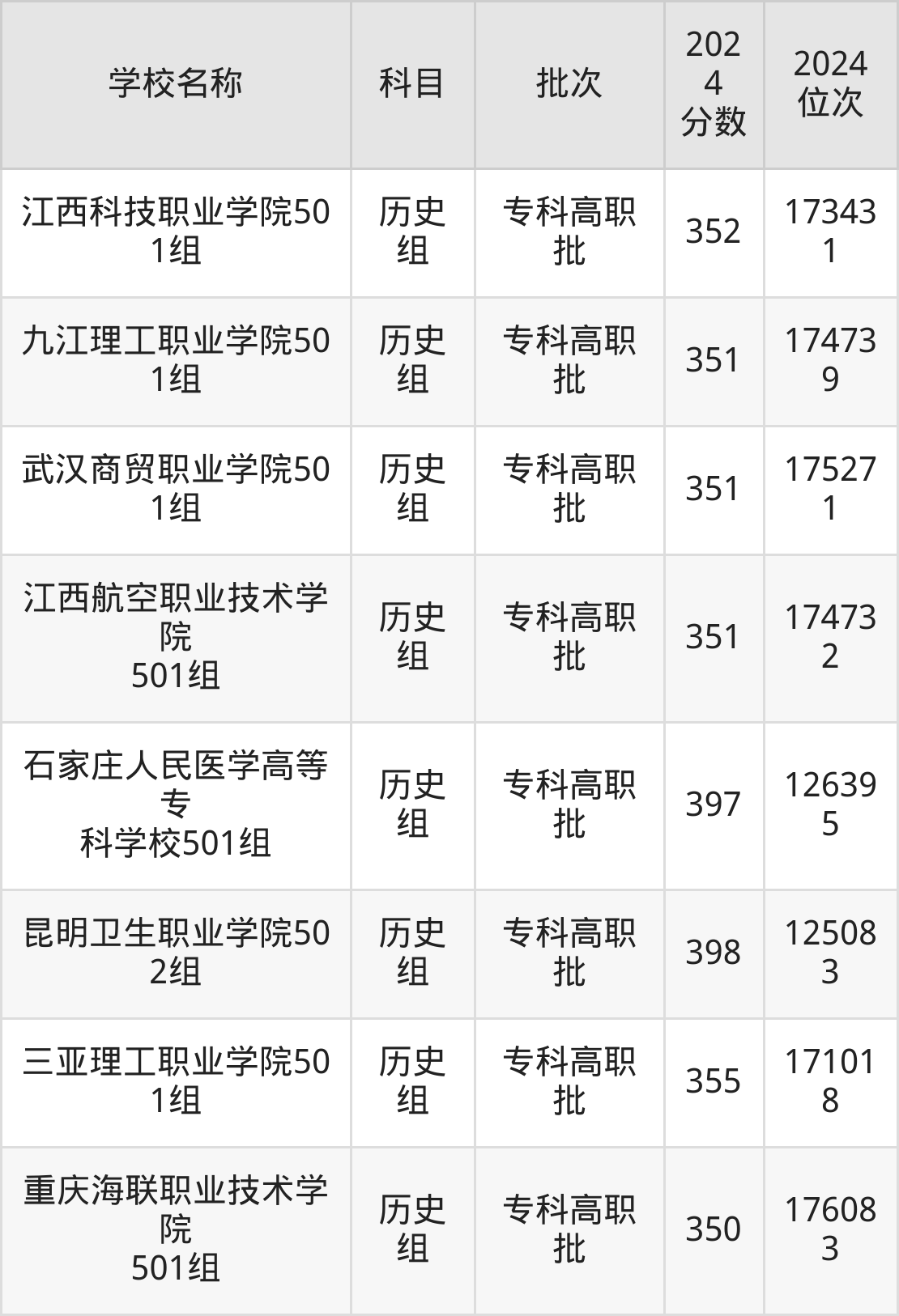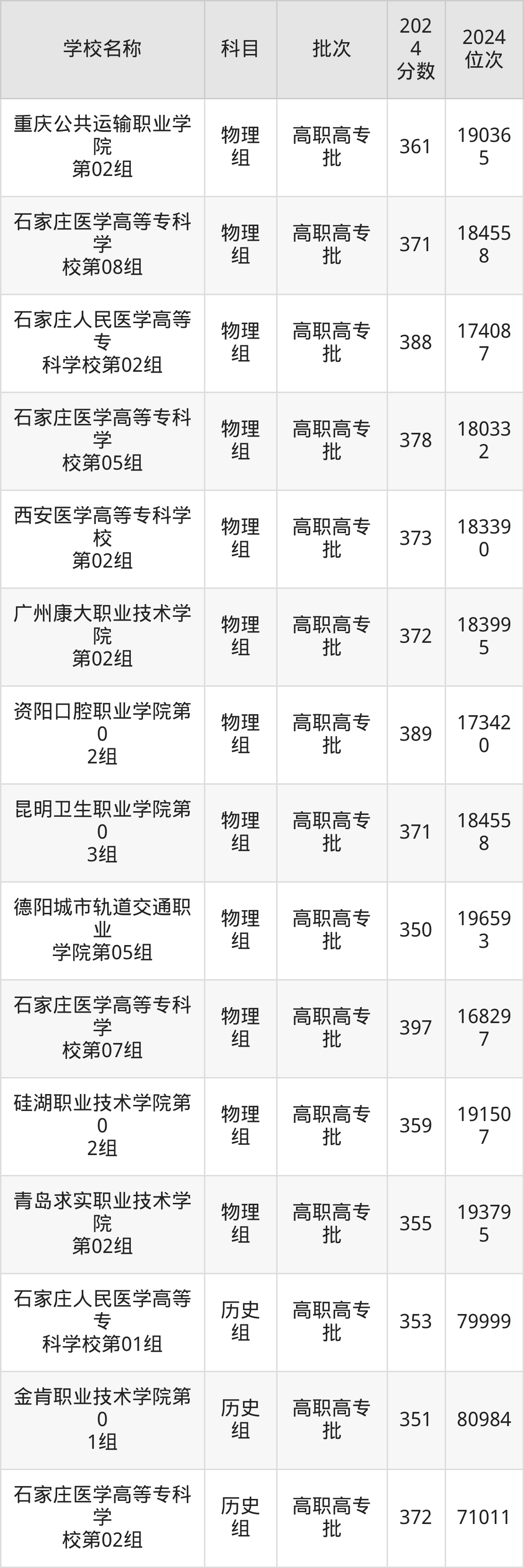 湖北高考历史组共有3所民办专科学校在350到400分之间录取,包含石家庄医学高等专科学校、石家庄人民医学高等专科学校、金肯职业技术学院。