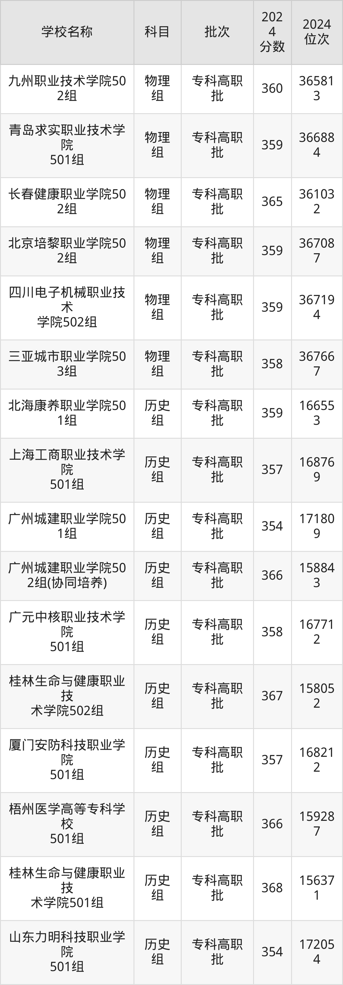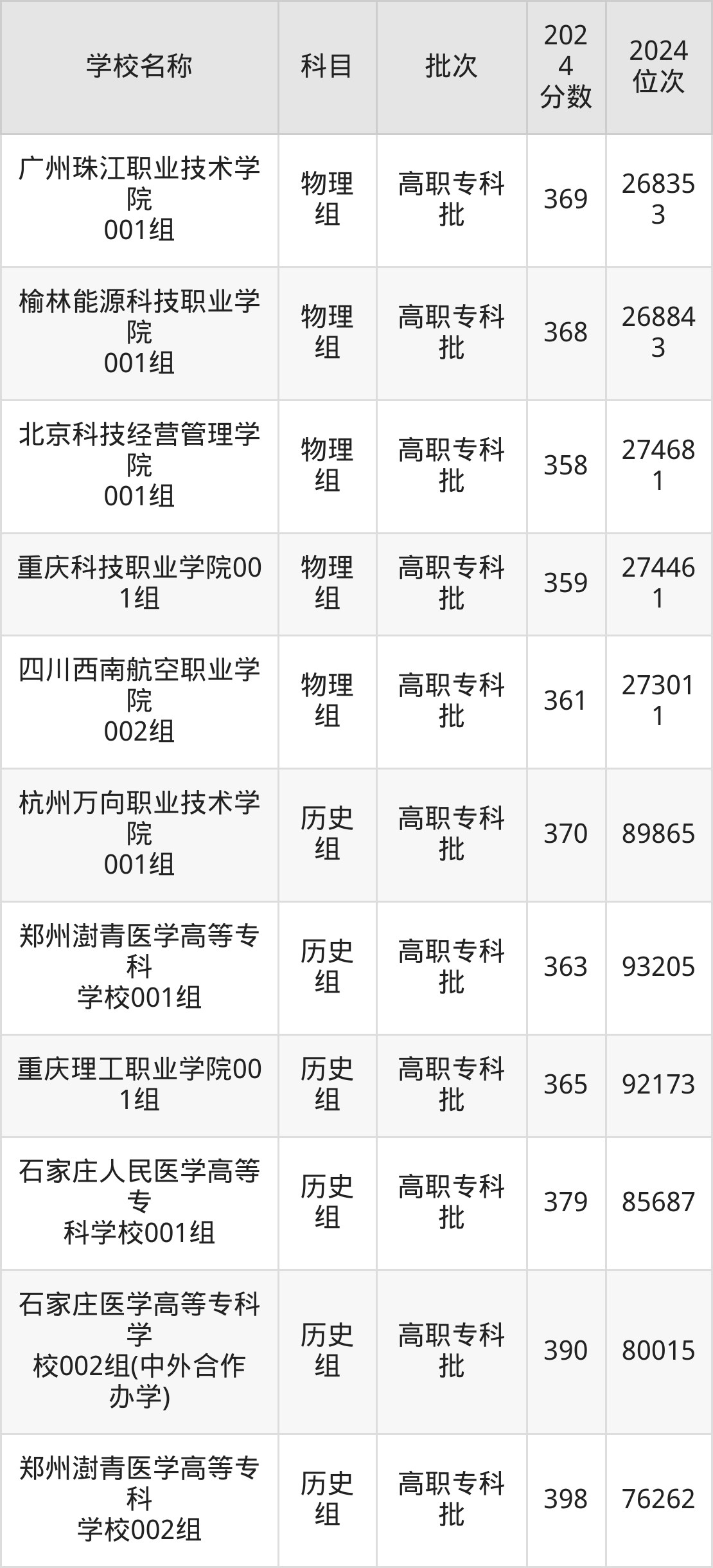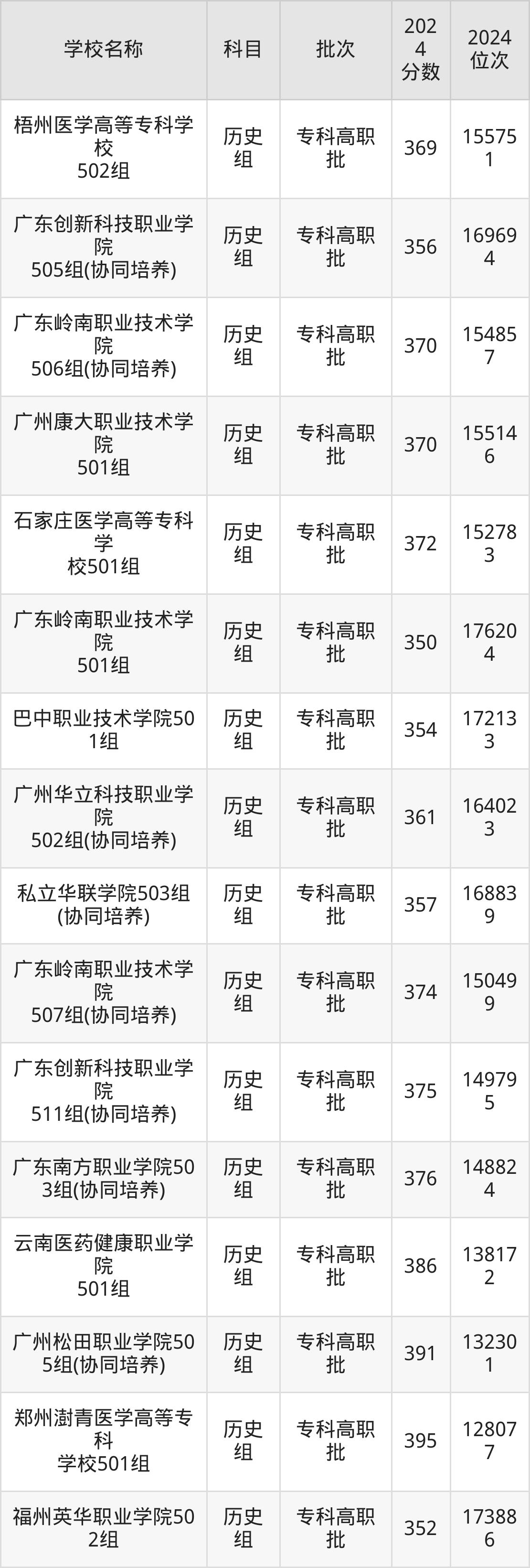 广东高考历史组共有28所民办专科学校在350到400分之间录取,包含昆明卫生职业学院、石家庄人民医学高等专科学校、郑州澍青医学高等专科学校、广州松田职业学院、云南医药健康职业学院、广东南方职业学院、广东创新科技职业学院、广东岭南职业技术学院、石家庄医学高等专科学校、广州康大职业技术学院。