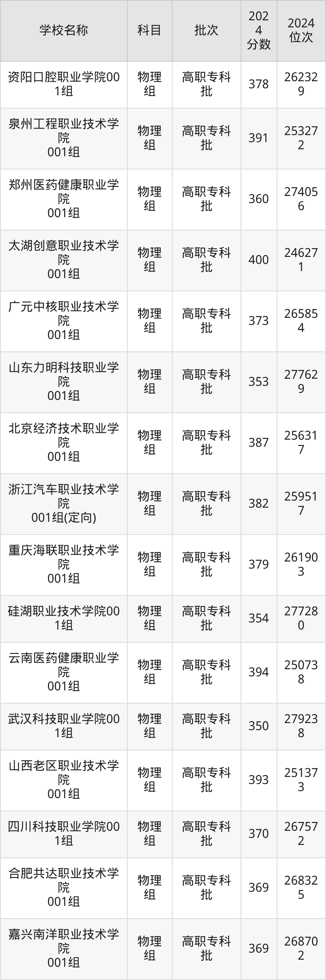 湖北高考物理组共有10所民办专科学校在350到400分之间录取,包含石家庄医学高等专科学校、资阳口腔职业学院、石家庄人民医学高等专科学校、西安医学高等专科学校、广州康大职业技术学院、昆明卫生职业学院、重庆公共运输职业学院、硅湖职业技术学院、青岛求实职业技术学院、德阳城市轨道交通职业学院。