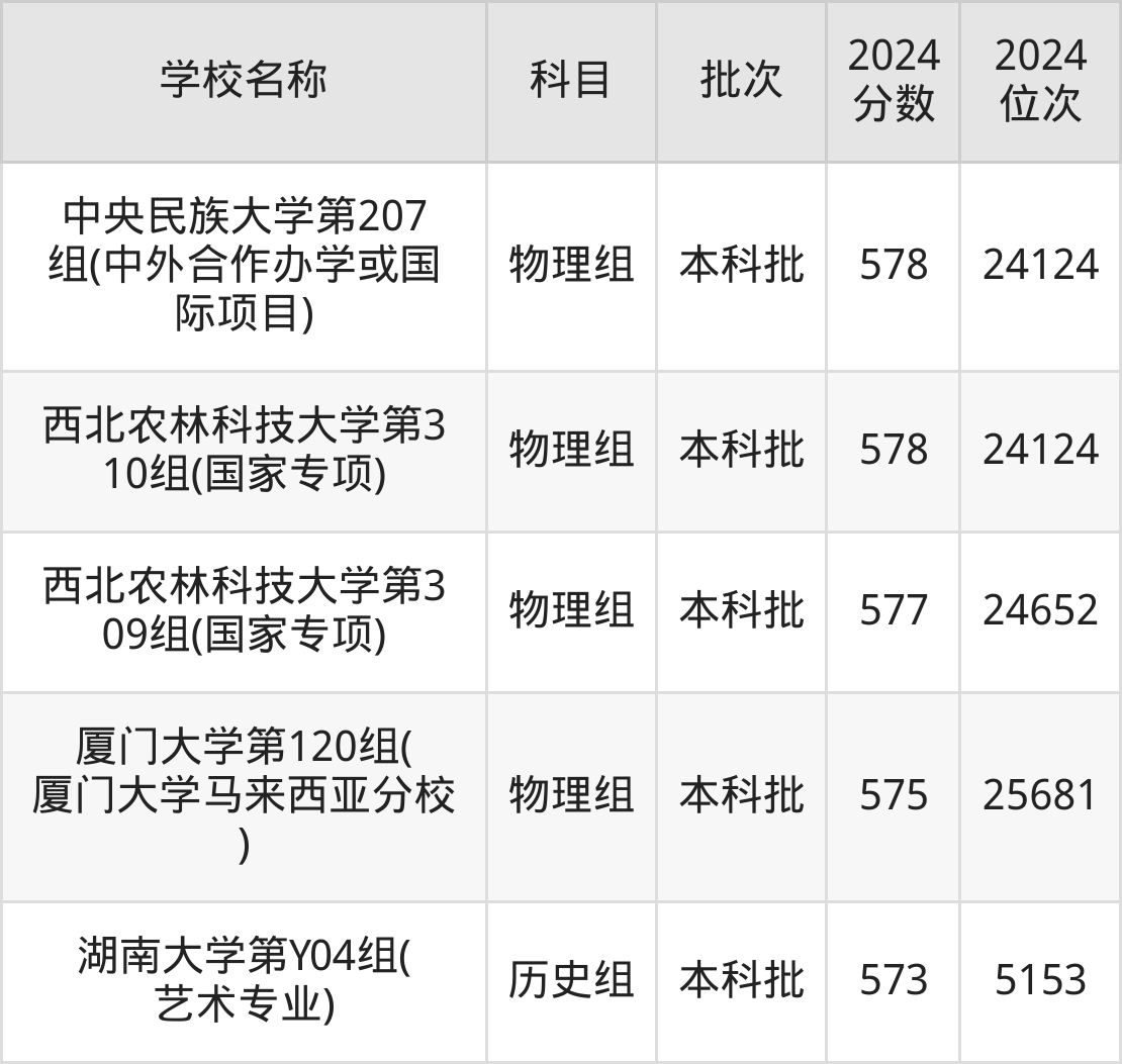 湖南高考物理组共有3所985大学在570到580分之间录取,包含中央民族大学、西北农林科技大学、厦门大学。