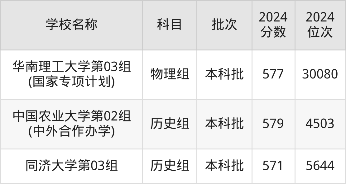 湖北高考历史组共有2所985大学在570到580分之间录取,包含中国农业大学、同济大学。