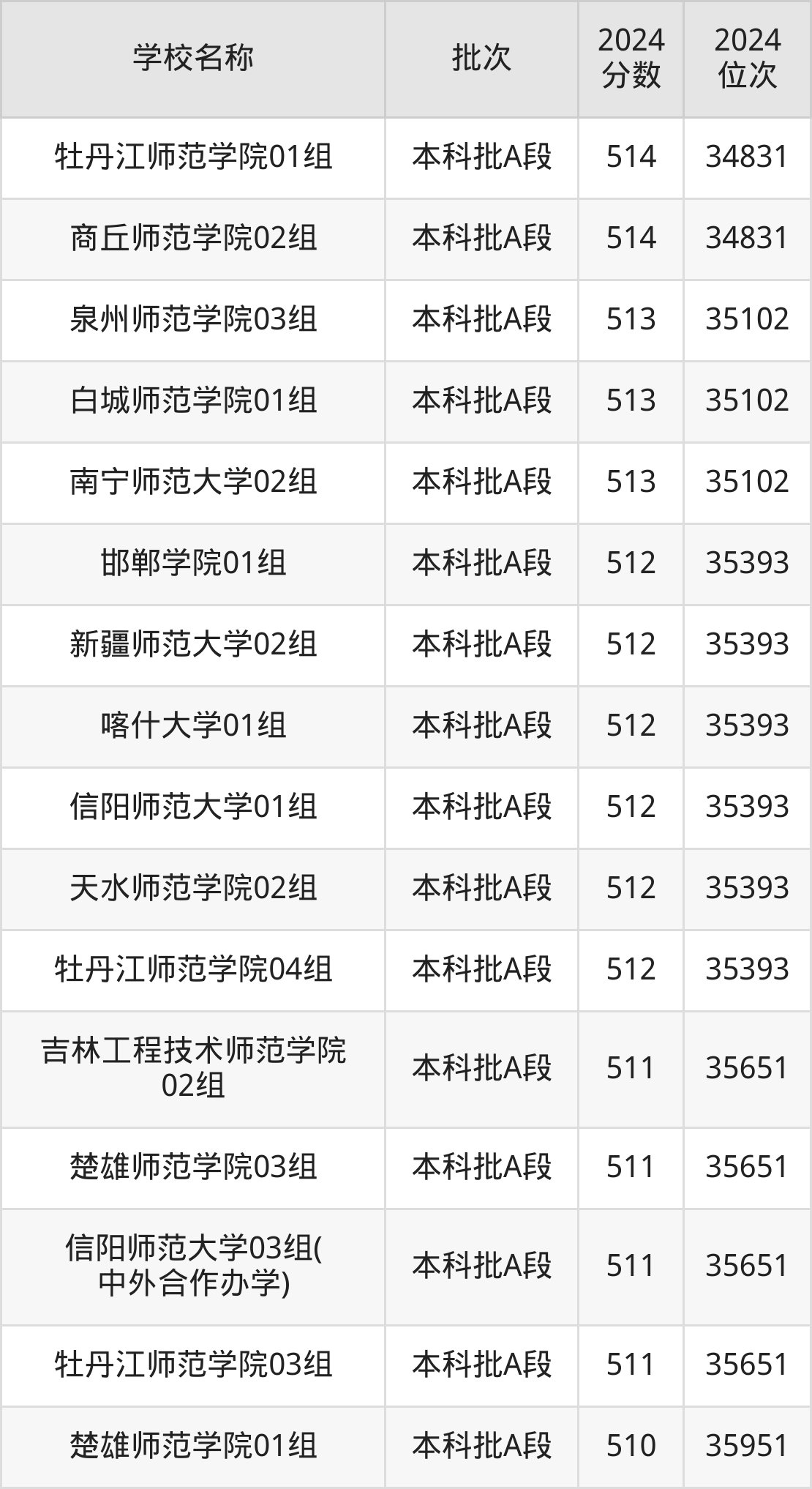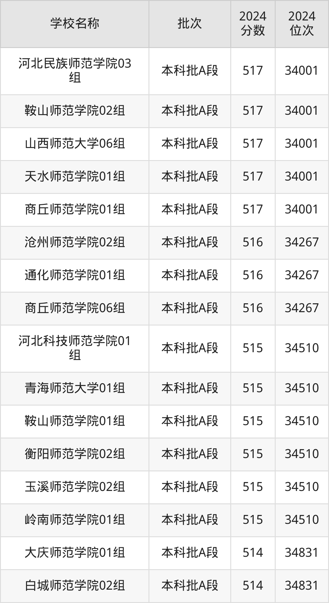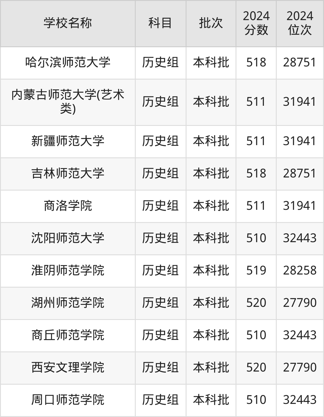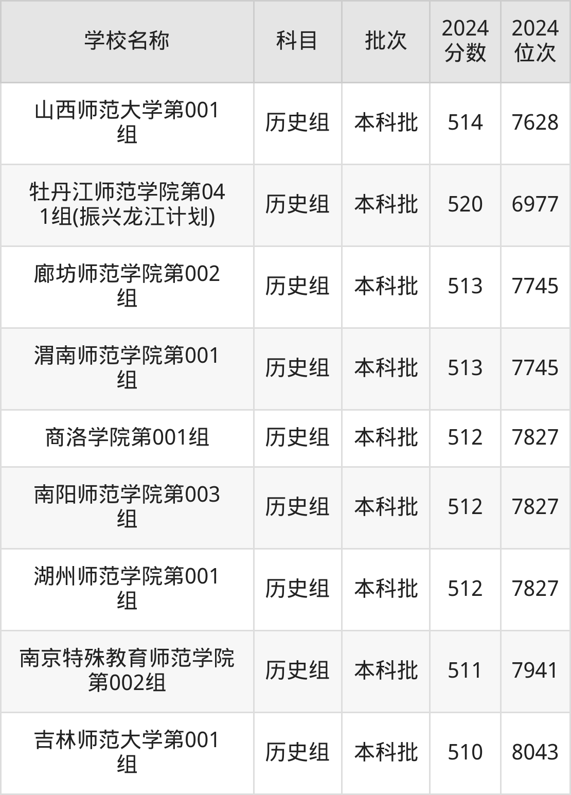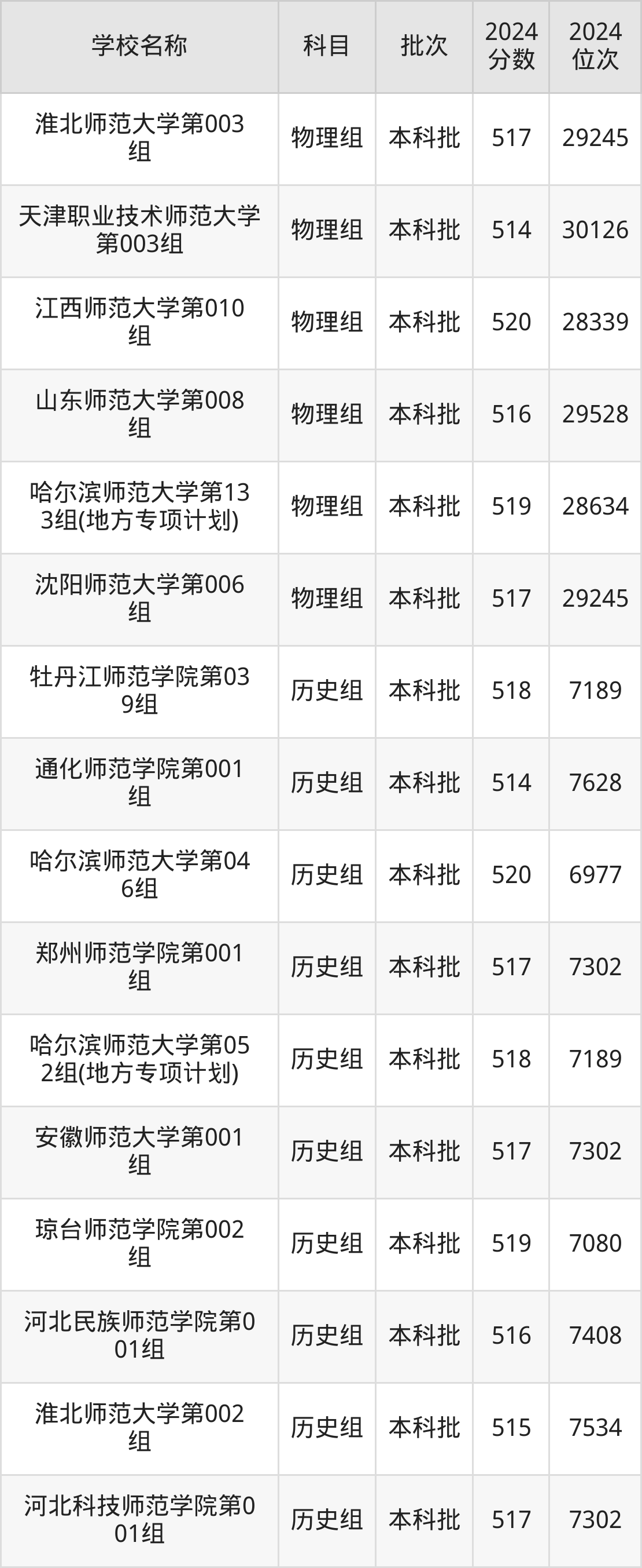 黑龙江高考历史组共有17所师范大学在510到520分之间录取,包含哈尔滨师范大学、牡丹江师范学院、琼台师范学院、河北科技师范学院、郑州师范学院、安徽师范大学、河北民族师范学院、淮北师范大学、通化师范学院、山西师范大学。