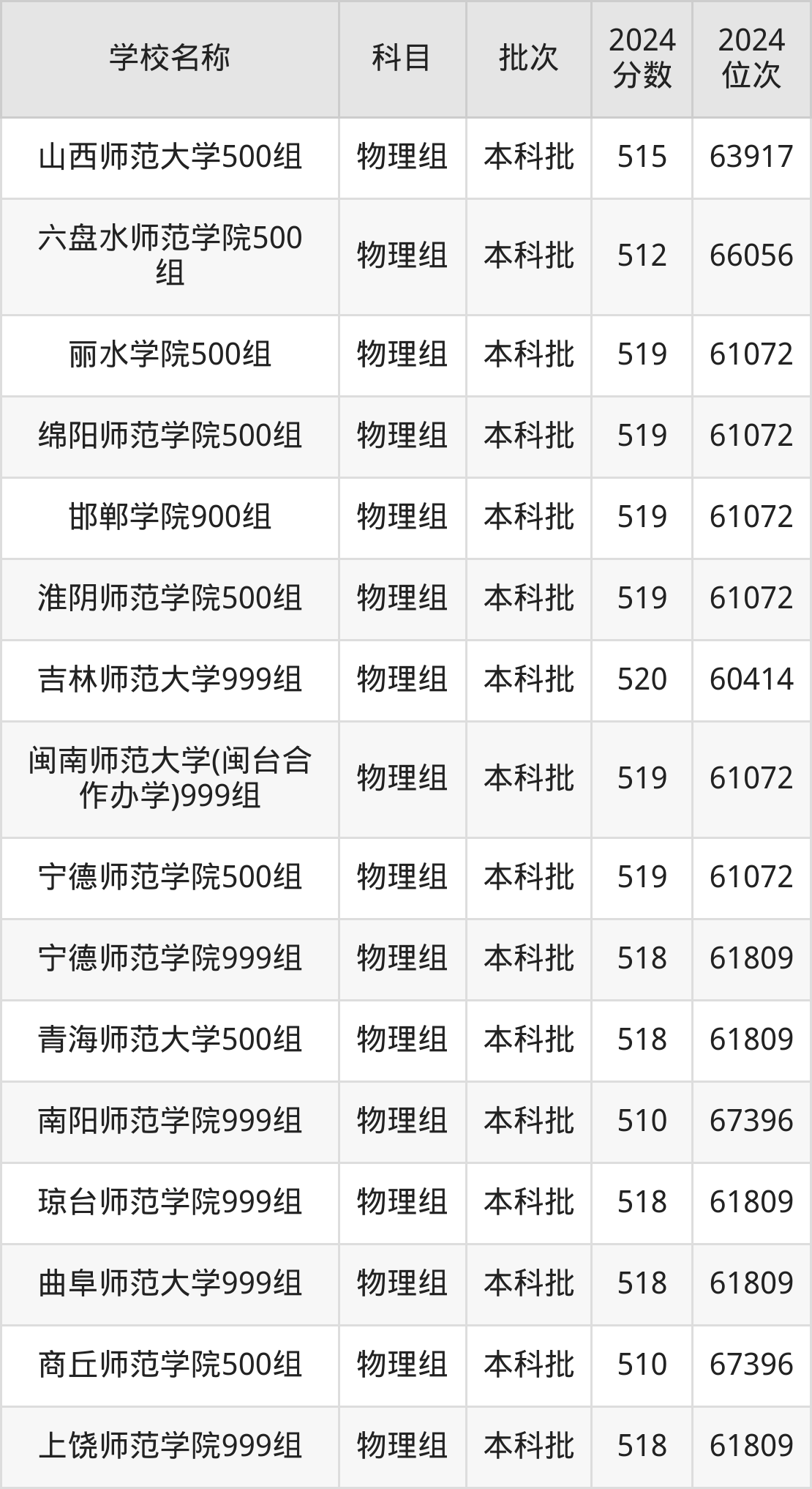 福建高考物理组共有36所师范大学在510到520分之间录取,包含吉林师范大学、长江师范学院、丽水学院、绵阳师范学院、邯郸学院、淮阴师范学院、南昌师范学院、闽南师范大学(闽台合作办学)、宁德师范学院、青海师范大学。
