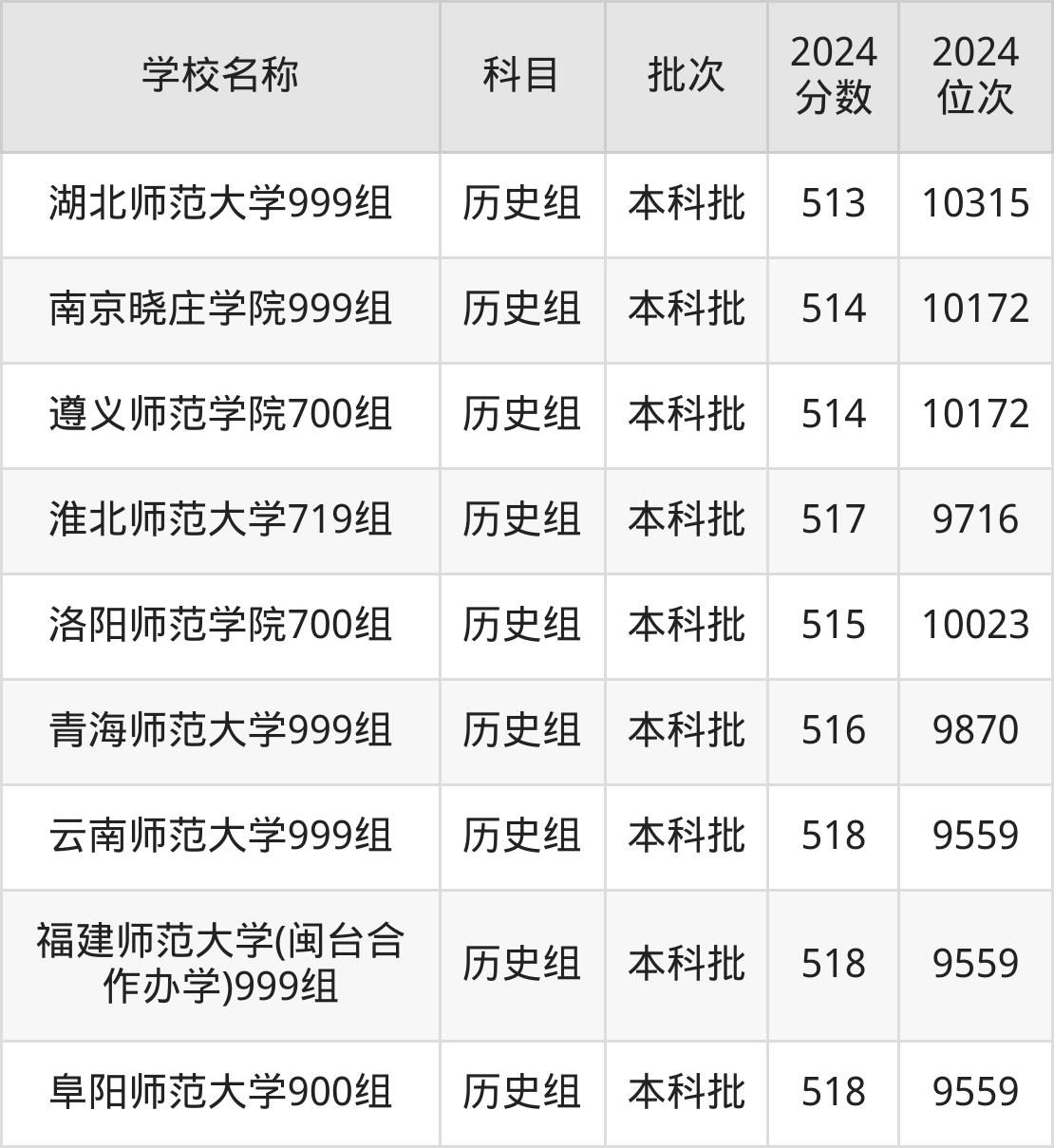 福建高考历史组共有10所师范大学在510到520分之间录取,包含阜阳师范大学、福建师范大学(闽台合作办学)、云南师范大学、淮北师范大学、青海师范大学、洛阳师范学院、遵义师范学院、南京晓庄学院、湖北师范大学、南昌师范学院。