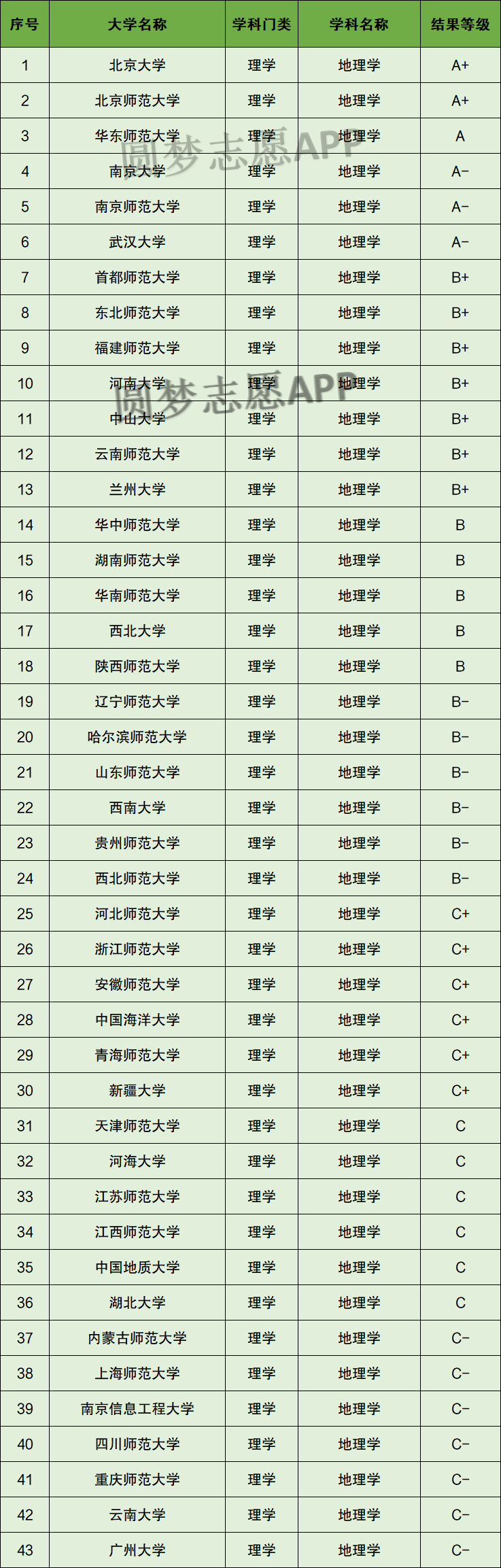 这些大学也可以认为是全国地理学学科最好的大学,不过地理学学科中,并不是只有上榜地理学学科评估结果的大学才值得选择,其他很多有地理学专业的大学也很好。