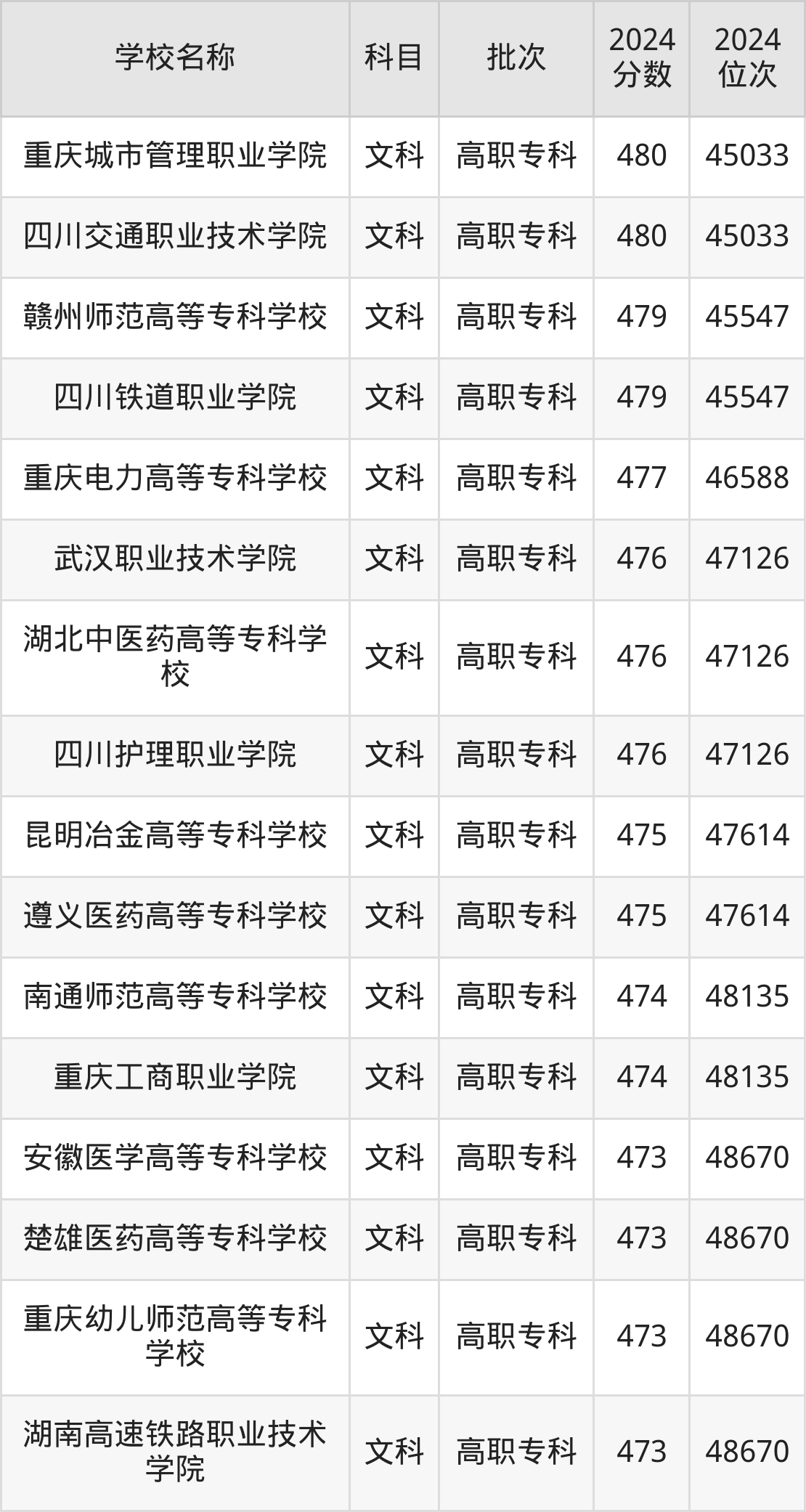 重庆高考历史组共有1所公办专科学校在470到480分之间录取,包含四川铁道职业学院。
