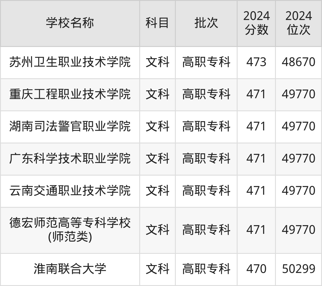 一、470到480分的公办专科学校最低分一览表