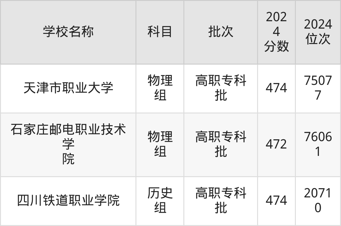 重庆高考物理组共有2所公办专科学校在470到480分之间录取,包含天津市职业大学、石家庄邮电职业技术学院。