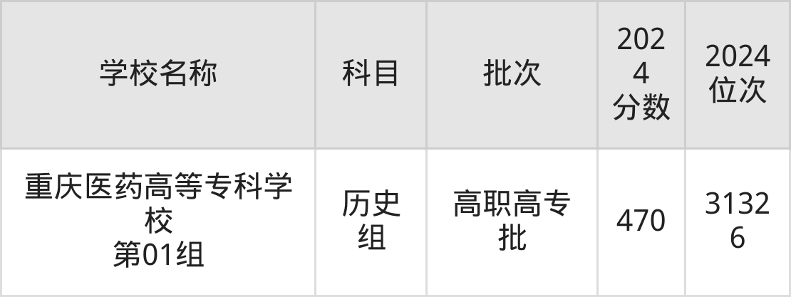 湖北高考历史组共有1所公办专科学校在470到480分之间录取,包含重庆医药高等专科学校。