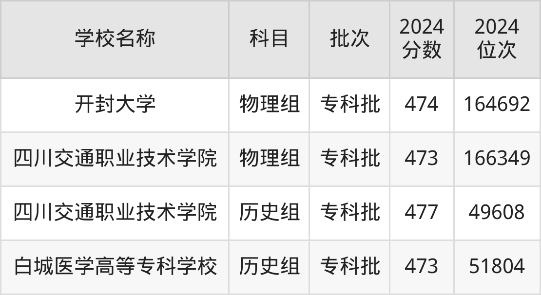河北高考历史组共有2所公办专科学校在470到480分之间录取,包含四川交通职业技术学院、白城医学高等专科学校。