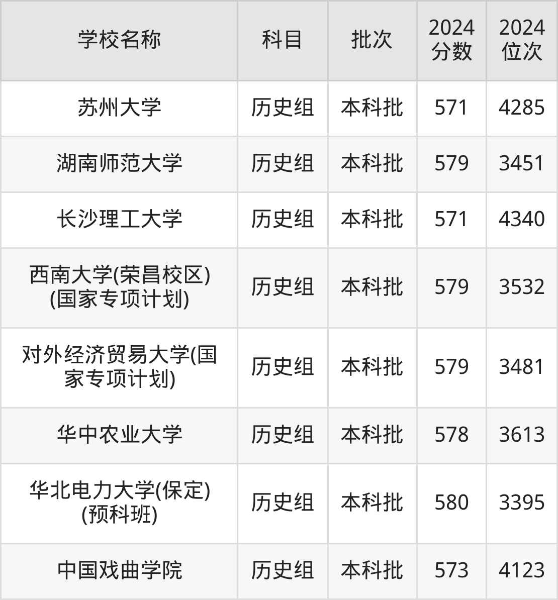 湖南高考历史组共有46所重点大学在570到580分之间录取,包含北京电影学院、中国矿业大学(北京)、云南大学、河北工业大学、南京农业大学、海南大学、武汉理工大学、首都经济贸易大学、长安大学、华中农业大学。