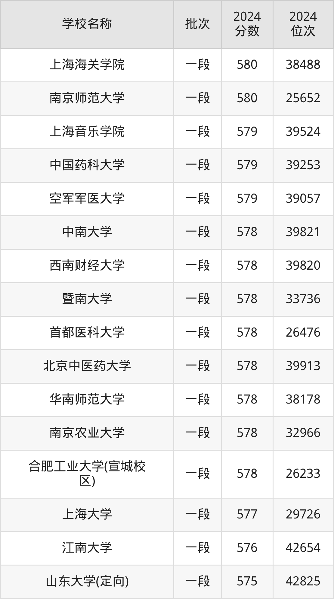 山东高考共有37所重点大学在570到580分之间录取,包含上海海关学院、南京师范大学、上海音乐学院、中国药科大学、空军军医大学、中南大学、西南财经大学、暨南大学、首都医科大学、北京中医药大学。