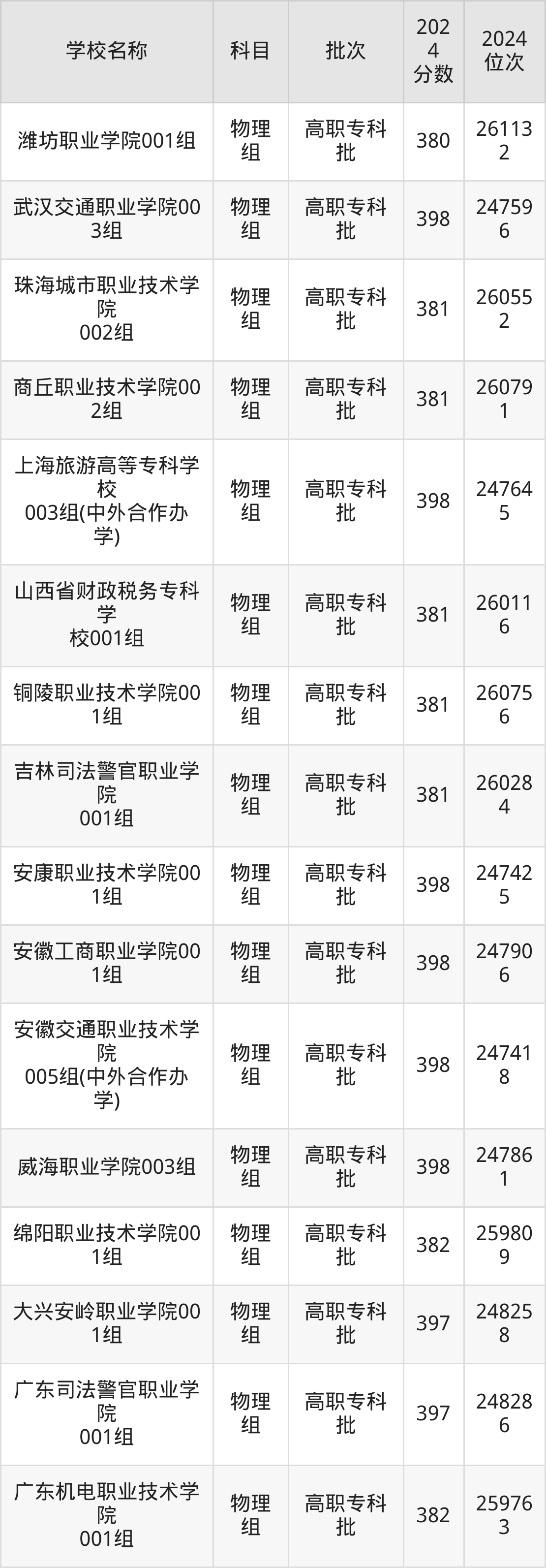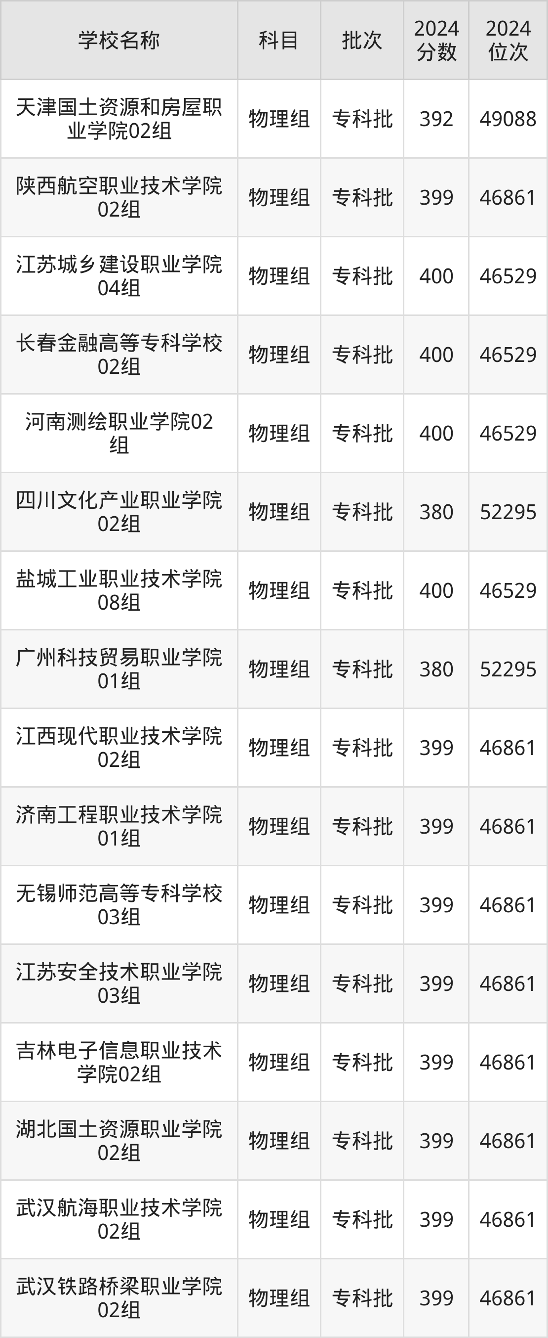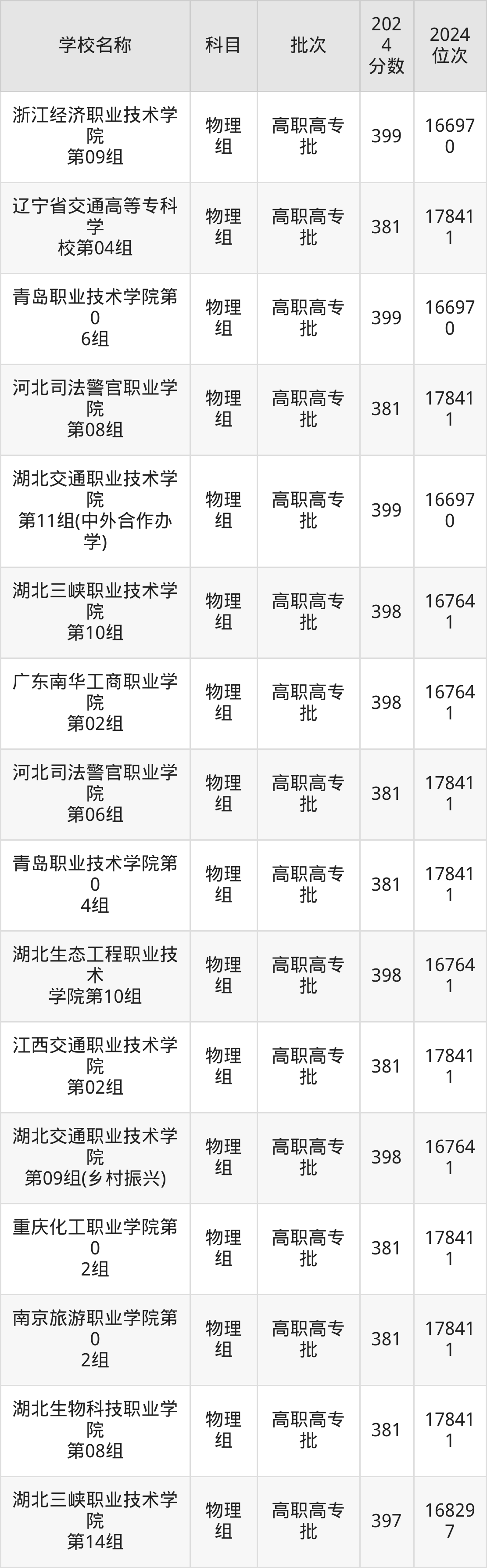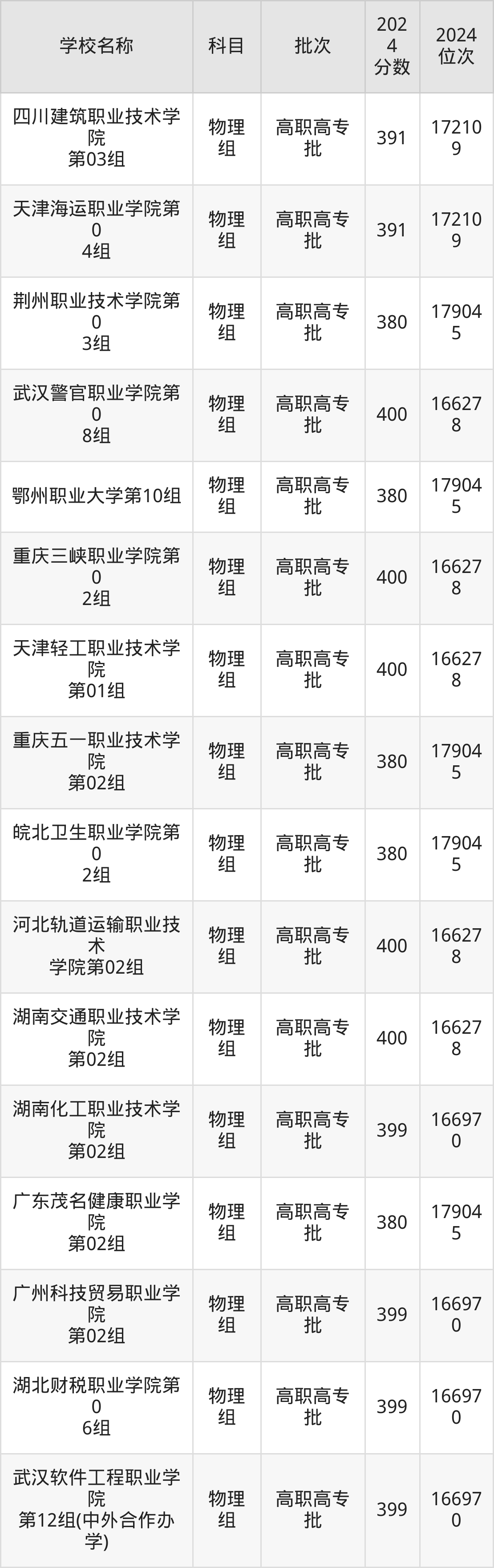 湖北高考物理组共有98所公办专科学校在380到400分之间录取,包含中山职业技术学院、武汉警官职业学院、重庆三峡职业学院、天津轻工职业技术学院、河北轨道运输职业技术学院、湖南交通职业技术学院、湖南化工职业技术学院、广州科技贸易职业学院、湖北财税职业学院、武汉软件工程职业学院。