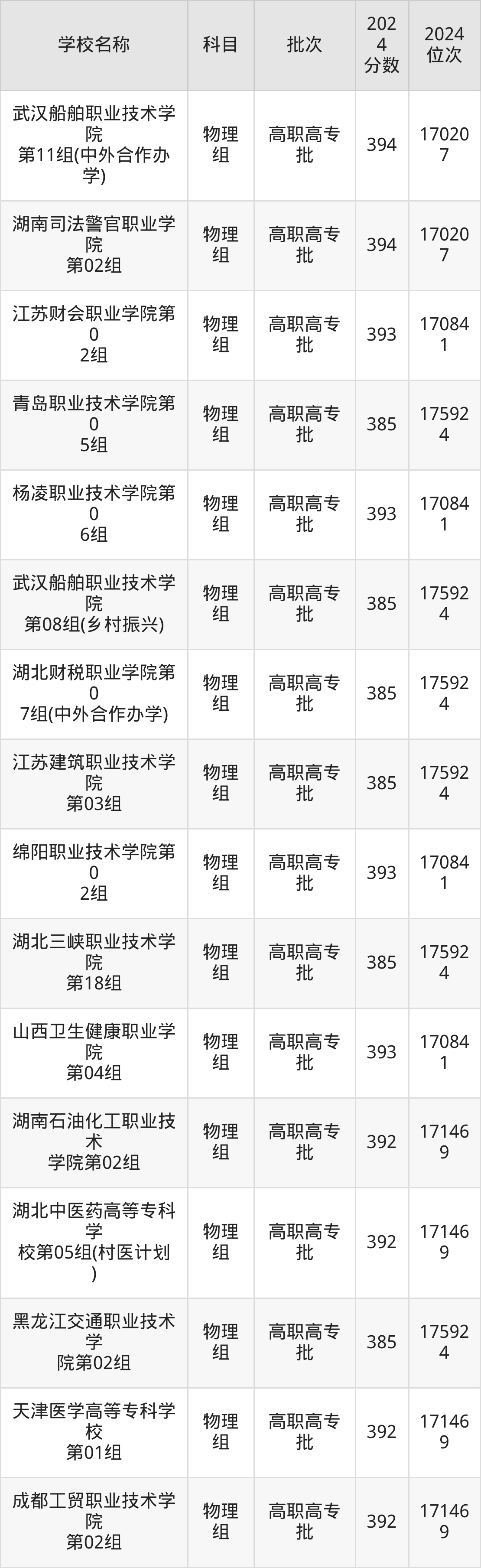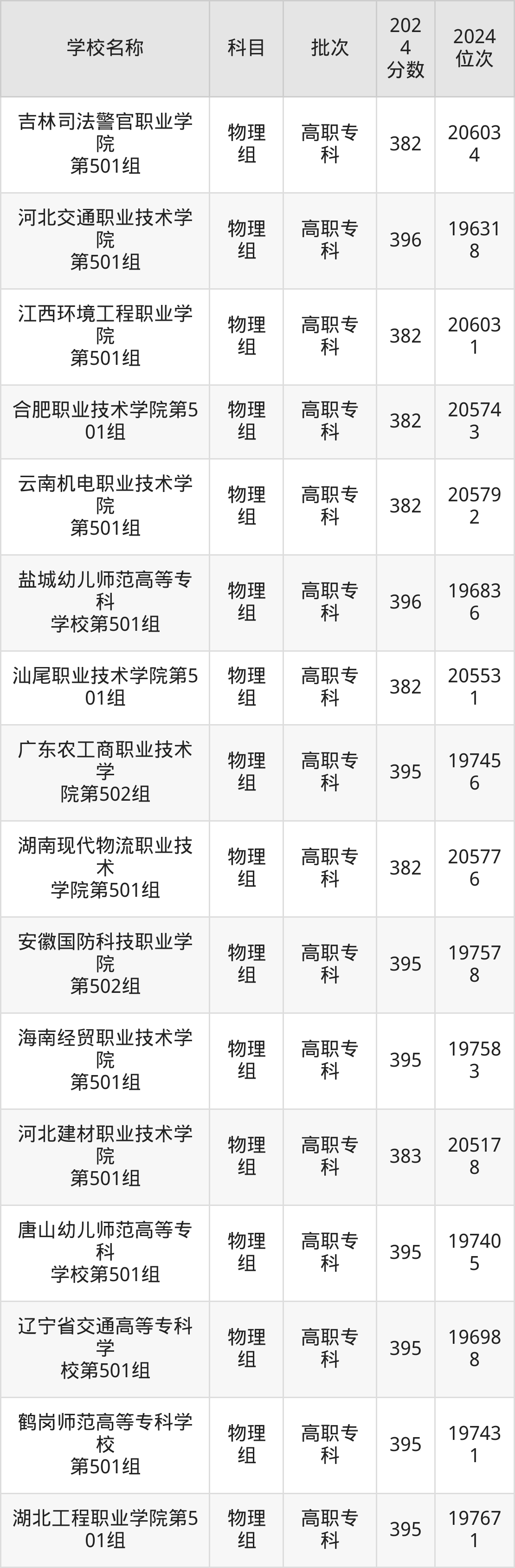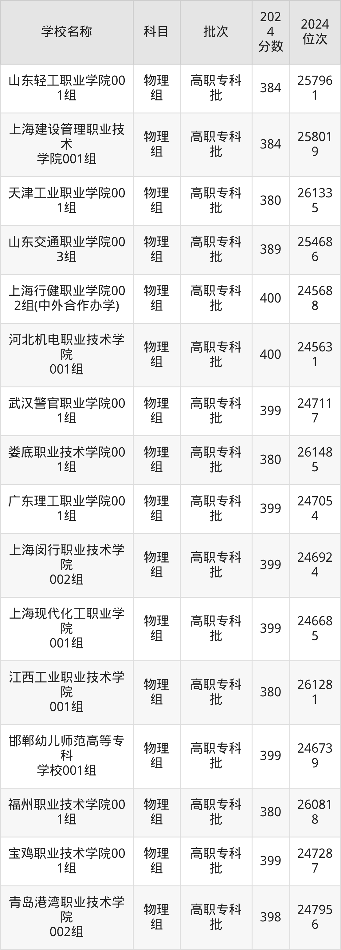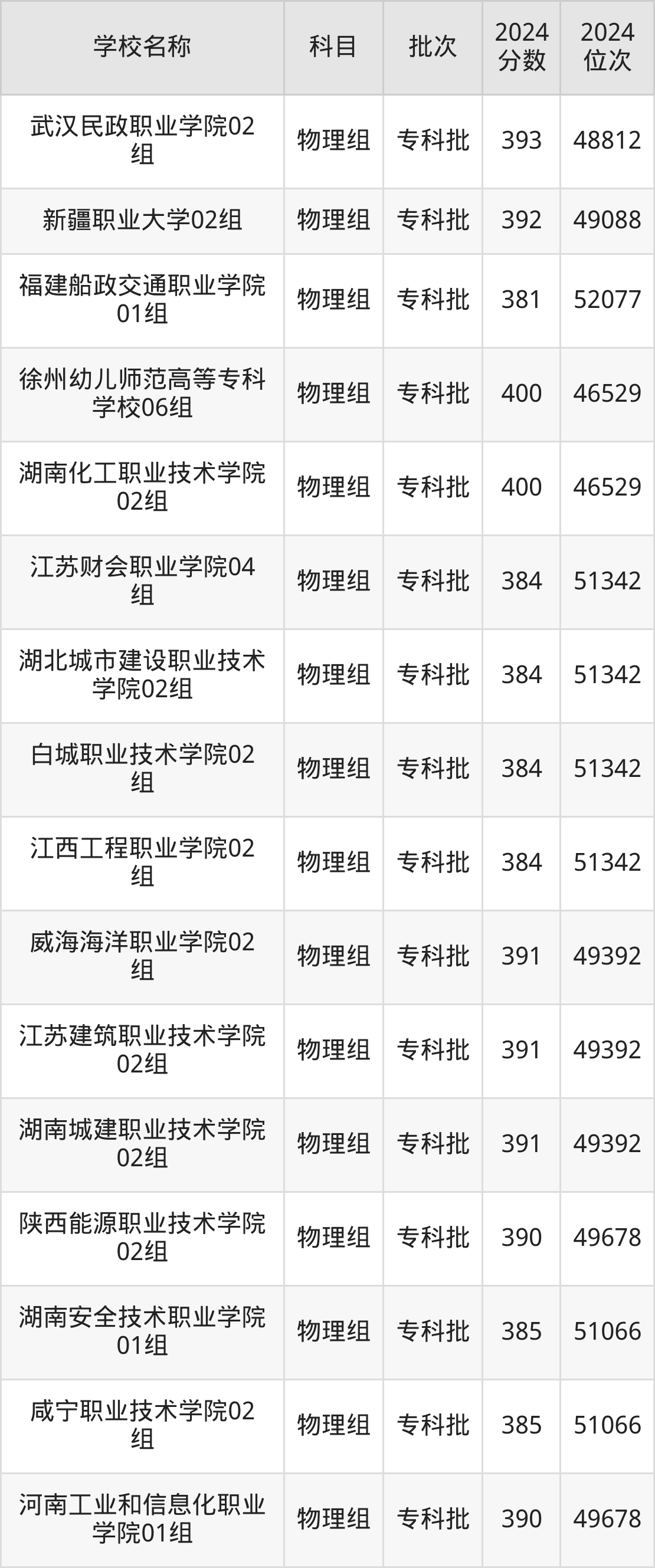 湖北高考物理组共有98所公办专科学校在380到400分之间录取,包含中山职业技术学院、武汉警官职业学院、重庆三峡职业学院、天津轻工职业技术学院、河北轨道运输职业技术学院、湖南交通职业技术学院、湖南化工职业技术学院、广州科技贸易职业学院、湖北财税职业学院、武汉软件工程职业学院。