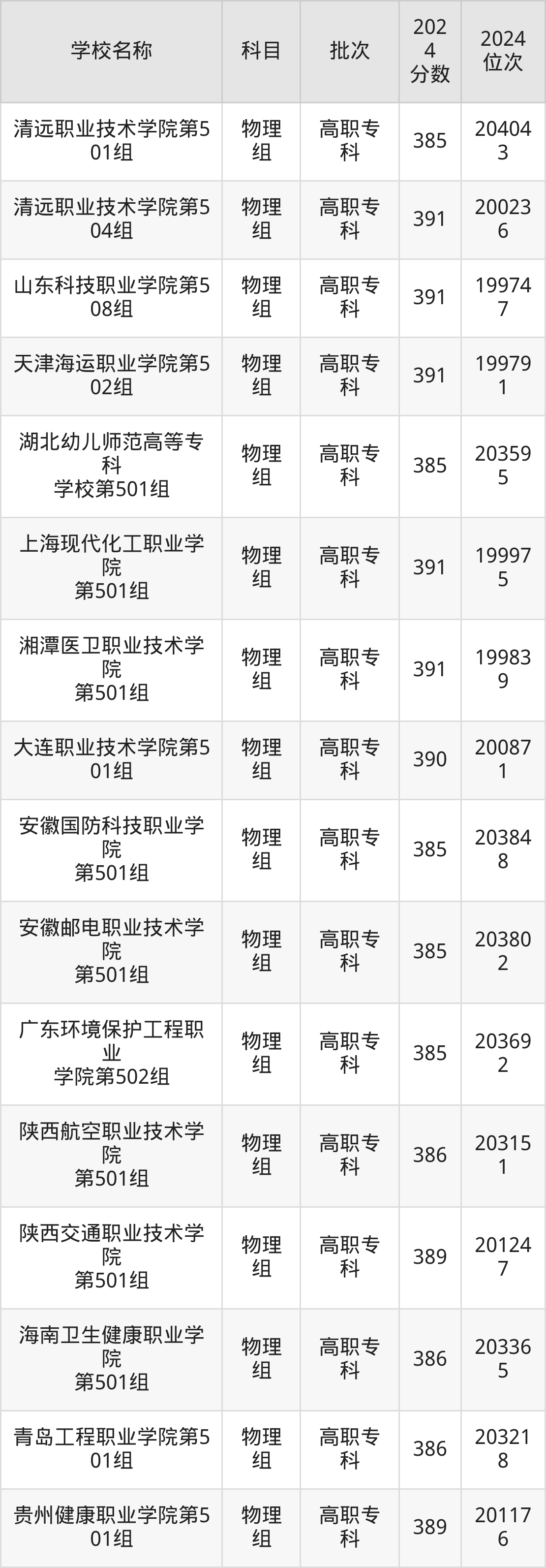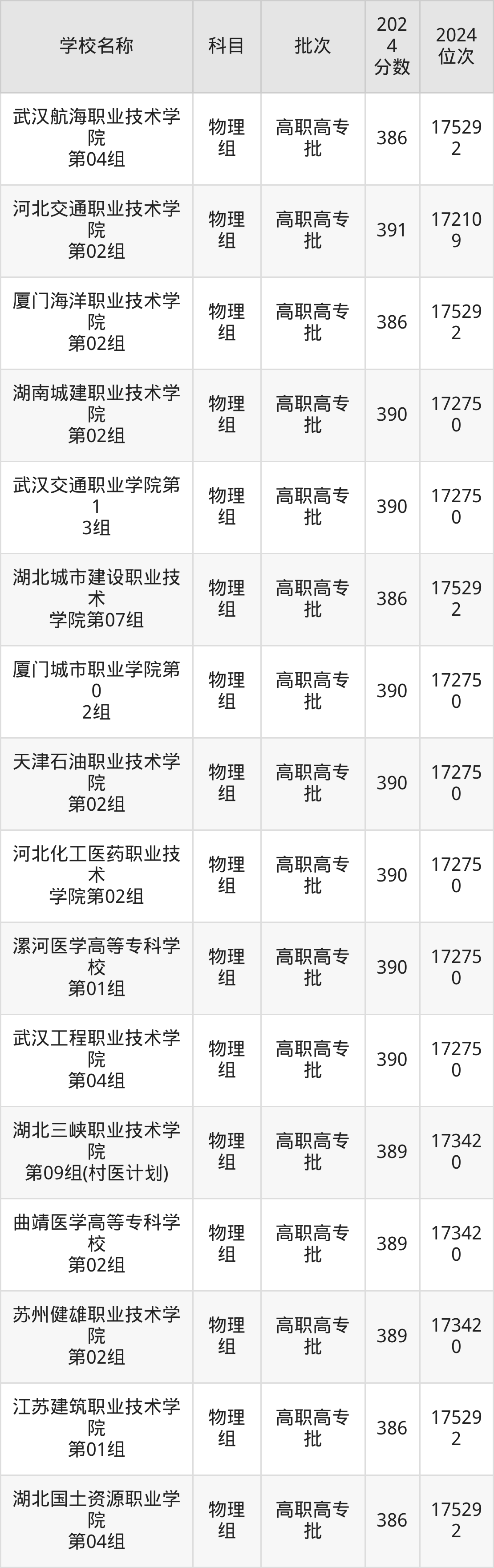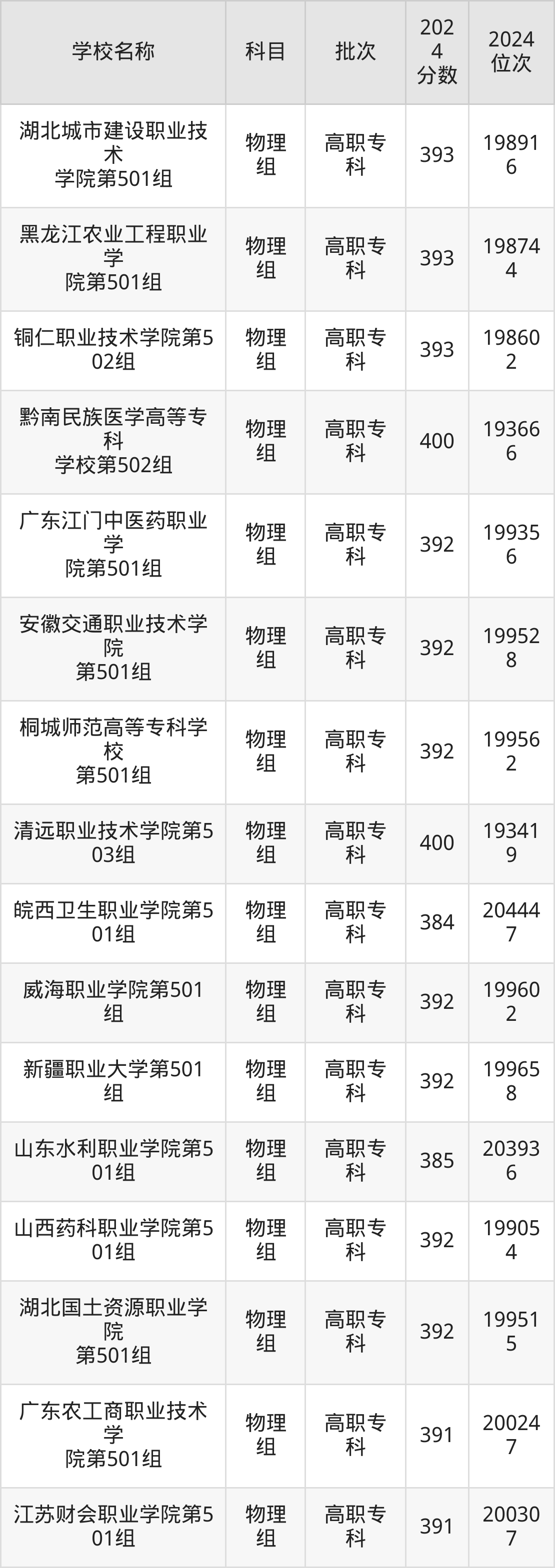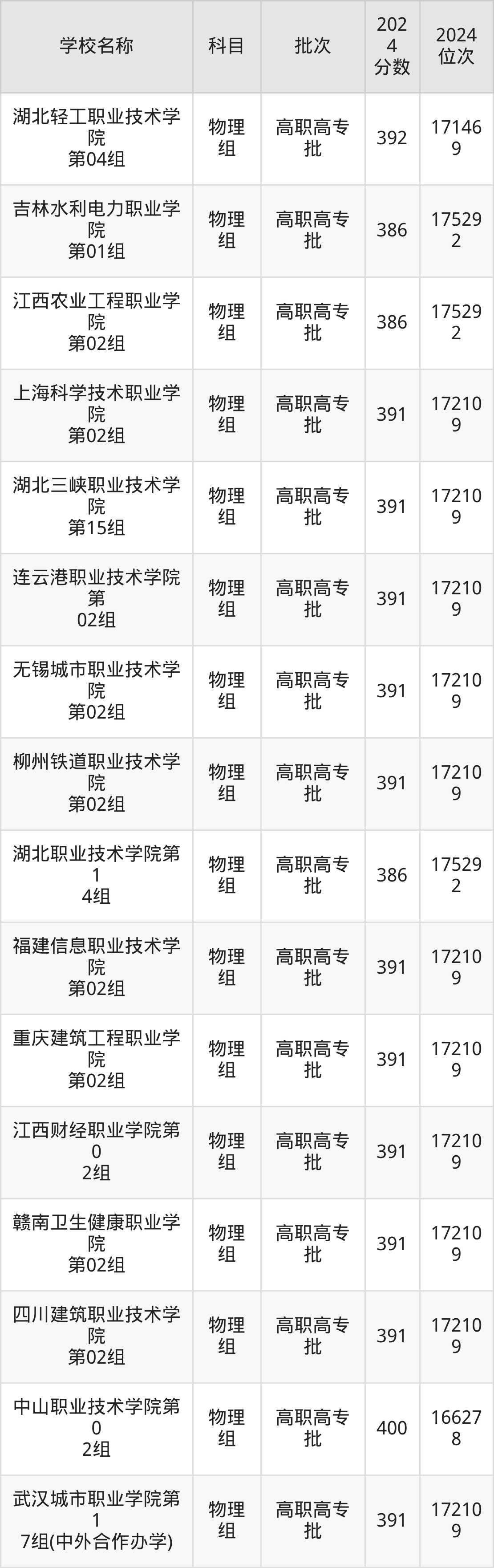 湖北高考物理组共有98所公办专科学校在380到400分之间录取,包含中山职业技术学院、武汉警官职业学院、重庆三峡职业学院、天津轻工职业技术学院、河北轨道运输职业技术学院、湖南交通职业技术学院、湖南化工职业技术学院、广州科技贸易职业学院、湖北财税职业学院、武汉软件工程职业学院。