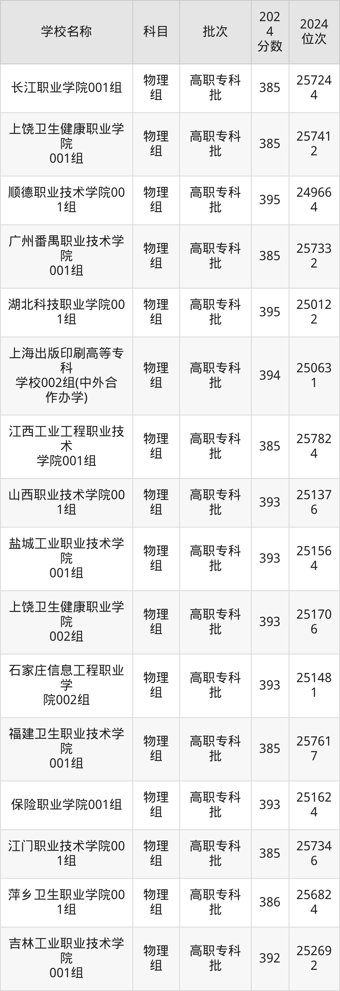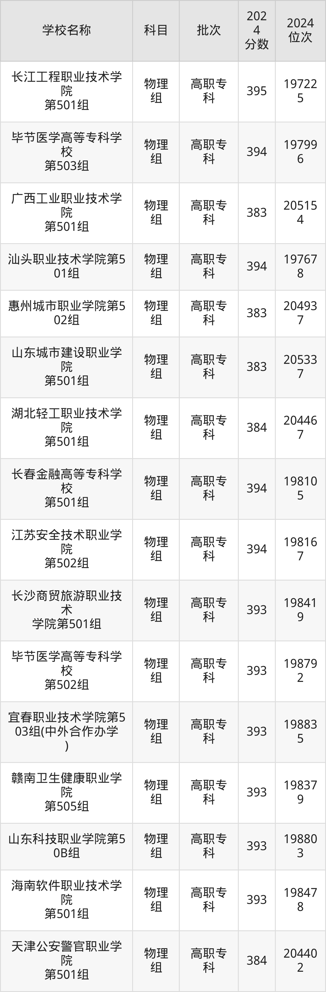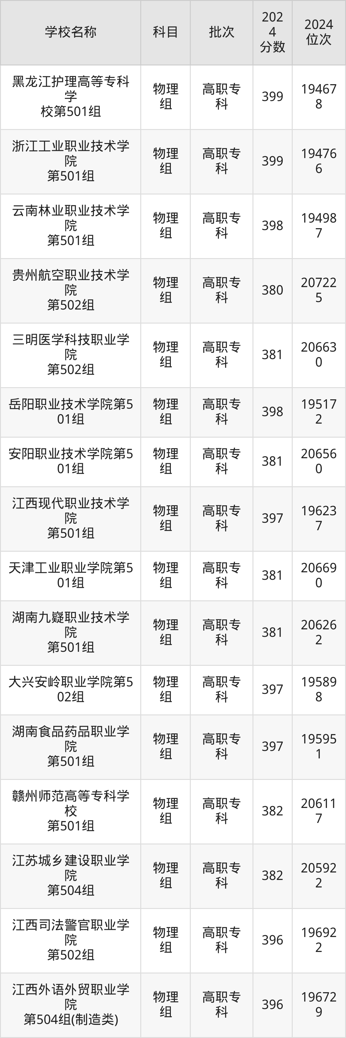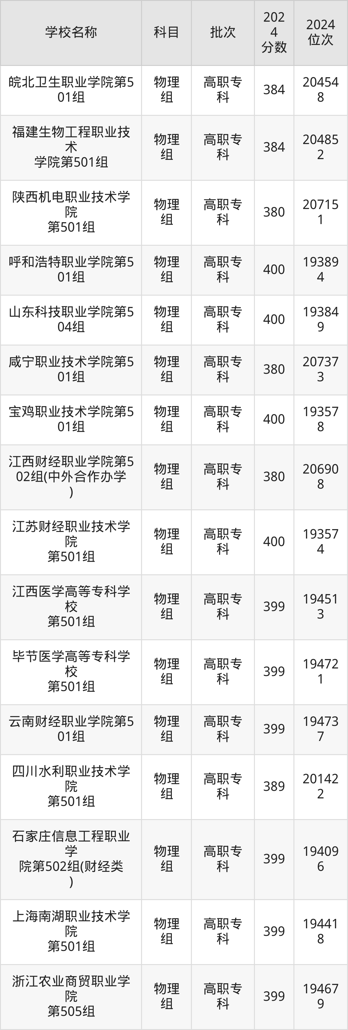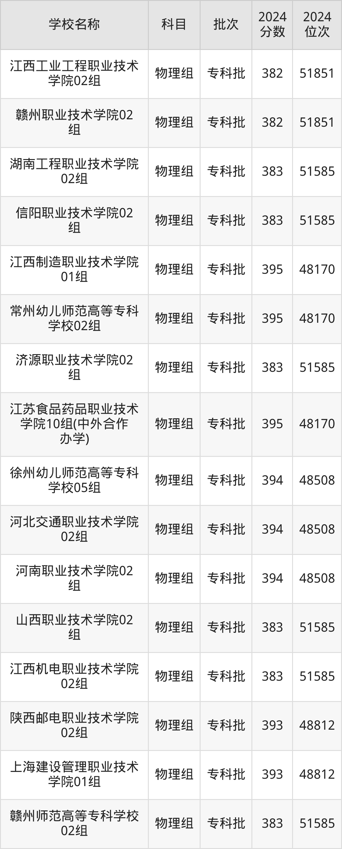 江西高考物理组共有100所公办专科学校在380到400分之间录取,包含黔南民族医学高等专科学校、清远职业技术学院、呼和浩特职业学院、山东科技职业学院、宝鸡职业技术学院、江苏财经职业技术学院、江西医学高等专科学校、毕节医学高等专科学校、云南财经职业学院、石家庄信息工程职业学院。