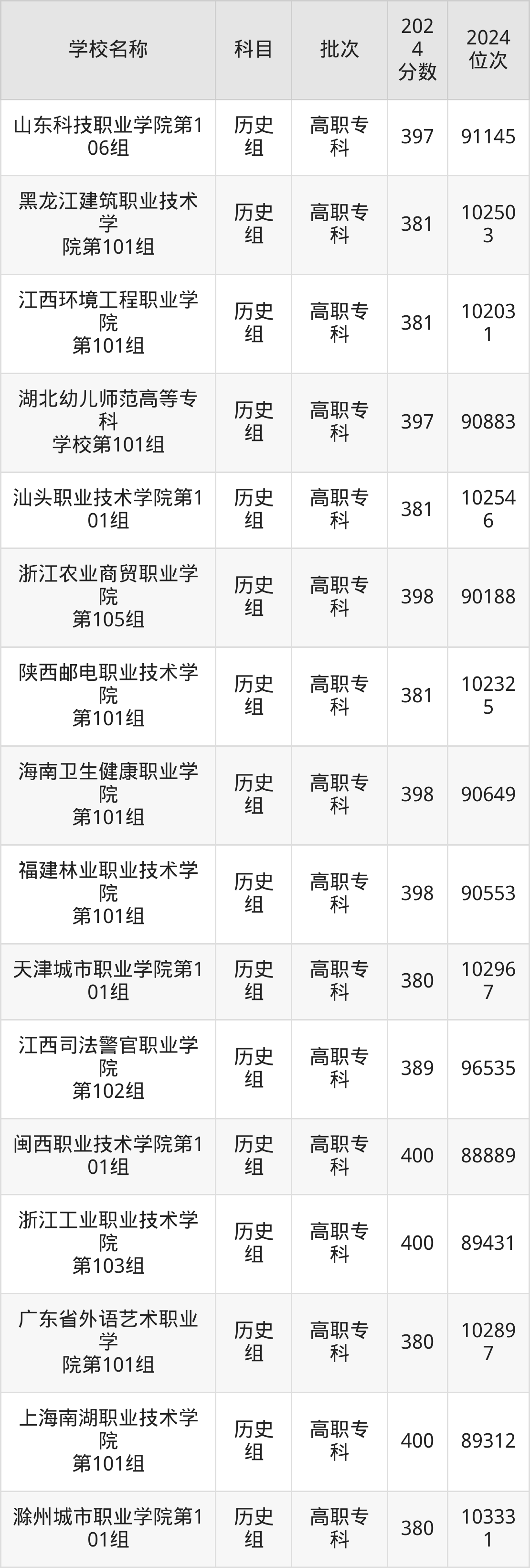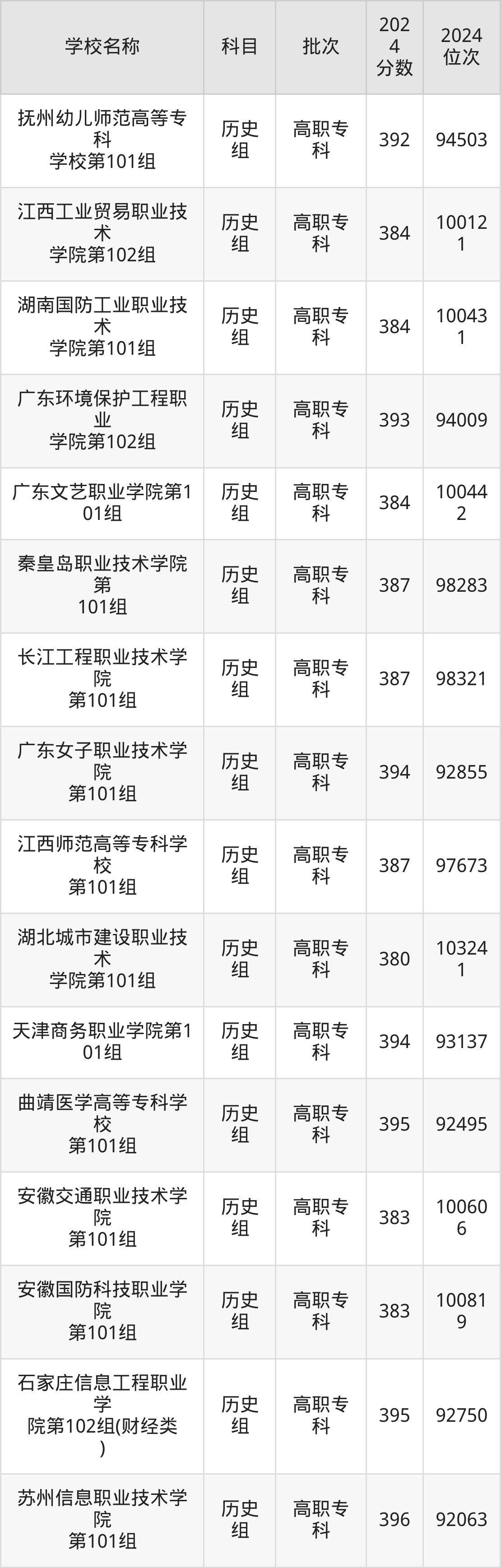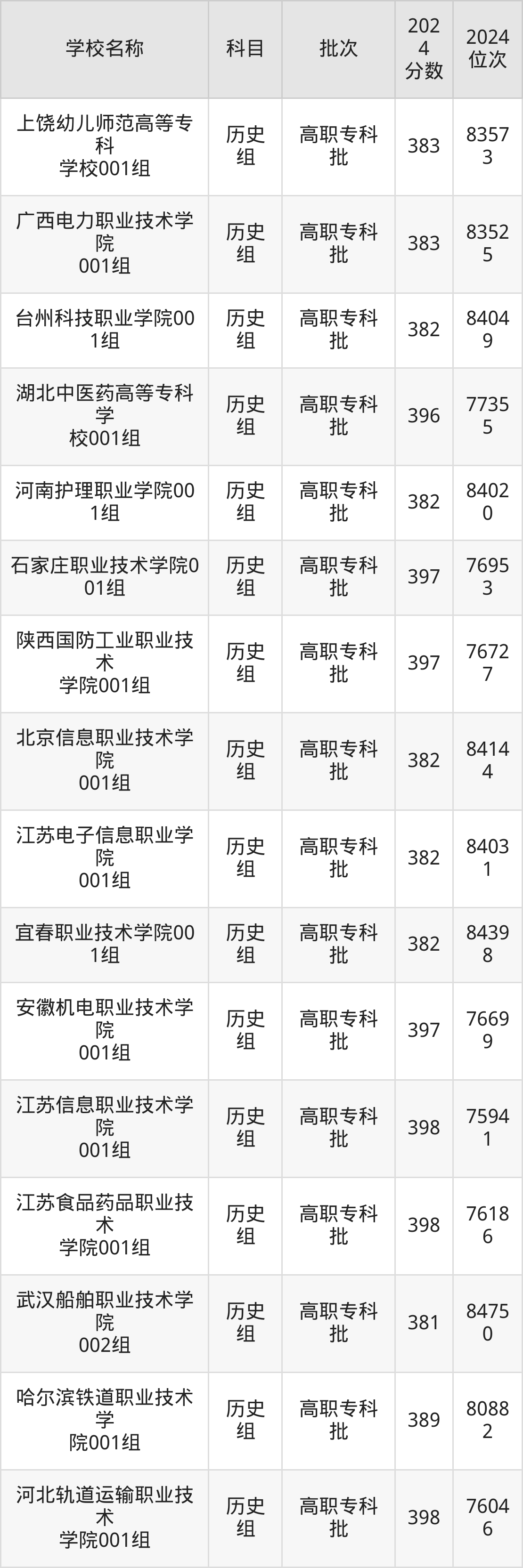 江西高考历史组共有75所公办专科学校在380到400分之间录取,包含上海南湖职业技术学院、浙江工业职业技术学院、闽西职业技术学院、山东科技职业学院、福建林业职业技术学院、海南卫生健康职业学院、浙江农业商贸职业学院、湖北幼儿师范高等专科学校、黑龙江护理高等专科学校、辽宁医药职业学院。