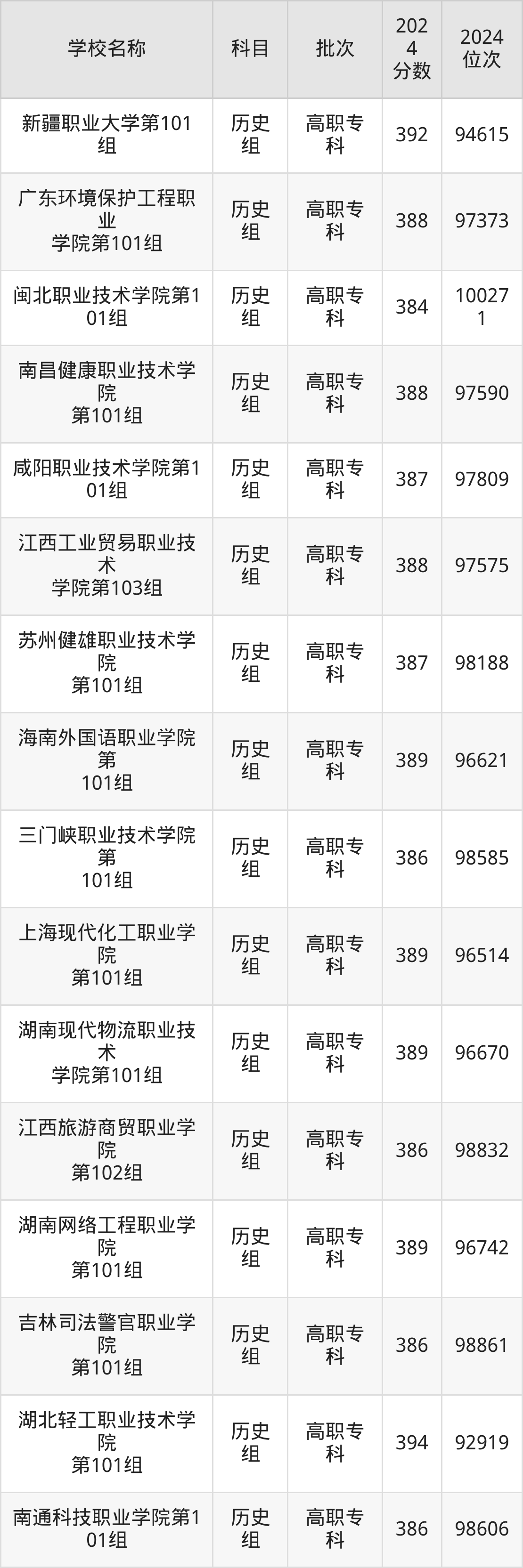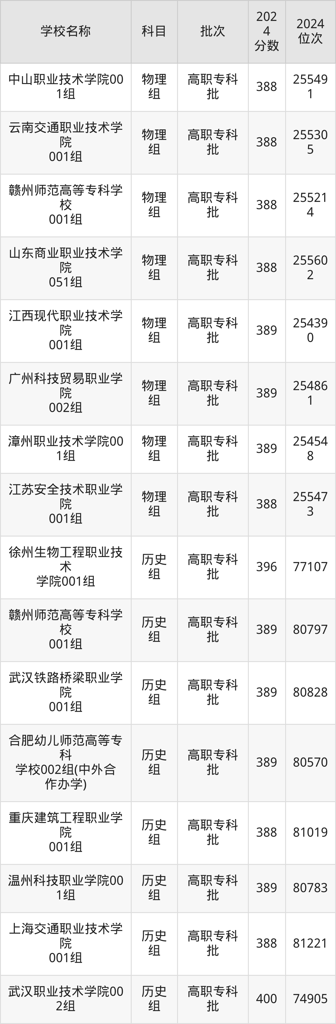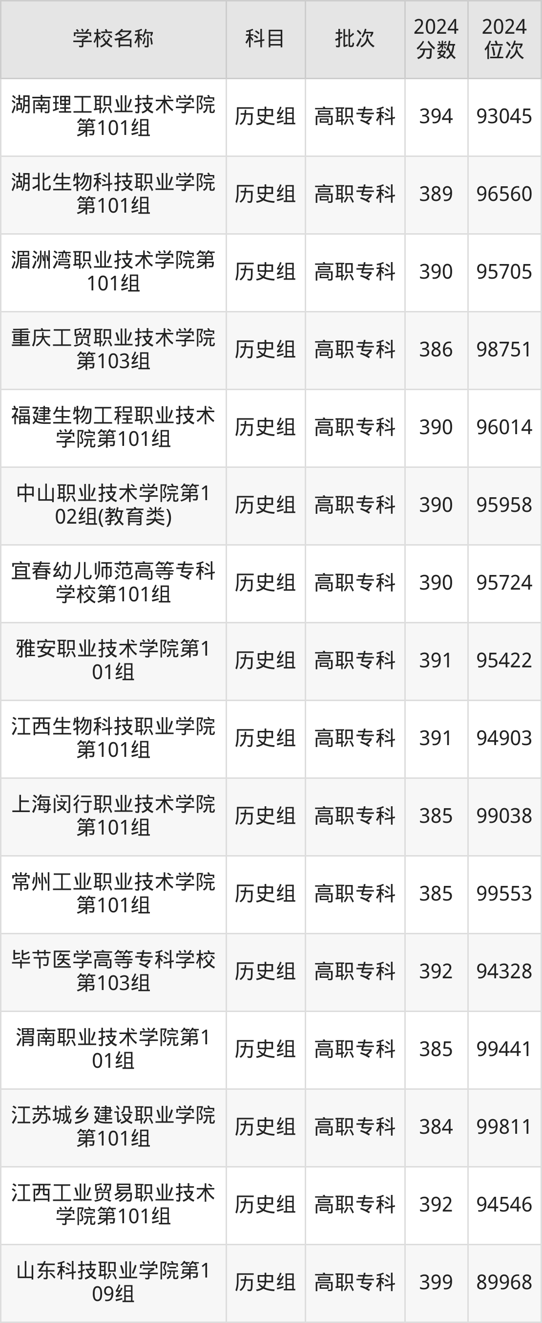 江西高考历史组共有75所公办专科学校在380到400分之间录取,包含上海南湖职业技术学院、浙江工业职业技术学院、闽西职业技术学院、山东科技职业学院、福建林业职业技术学院、海南卫生健康职业学院、浙江农业商贸职业学院、湖北幼儿师范高等专科学校、黑龙江护理高等专科学校、辽宁医药职业学院。