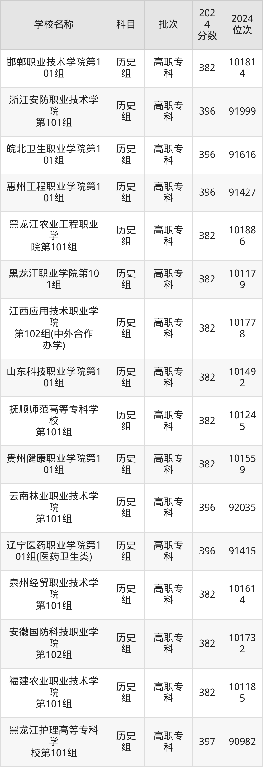 安徽高考历史组共有68所公办专科学校在380到400分之间录取,包含黔东南民族职业技术学院、武汉职业技术学院、黑龙江护理高等专科学校、盐城幼儿师范高等专科学校、甘肃卫生职业学院、唐山职业技术学院、安庆医药高等专科学校、河北轨道运输职业技术学院、江苏财会职业学院、江苏食品药品职业技术学院。