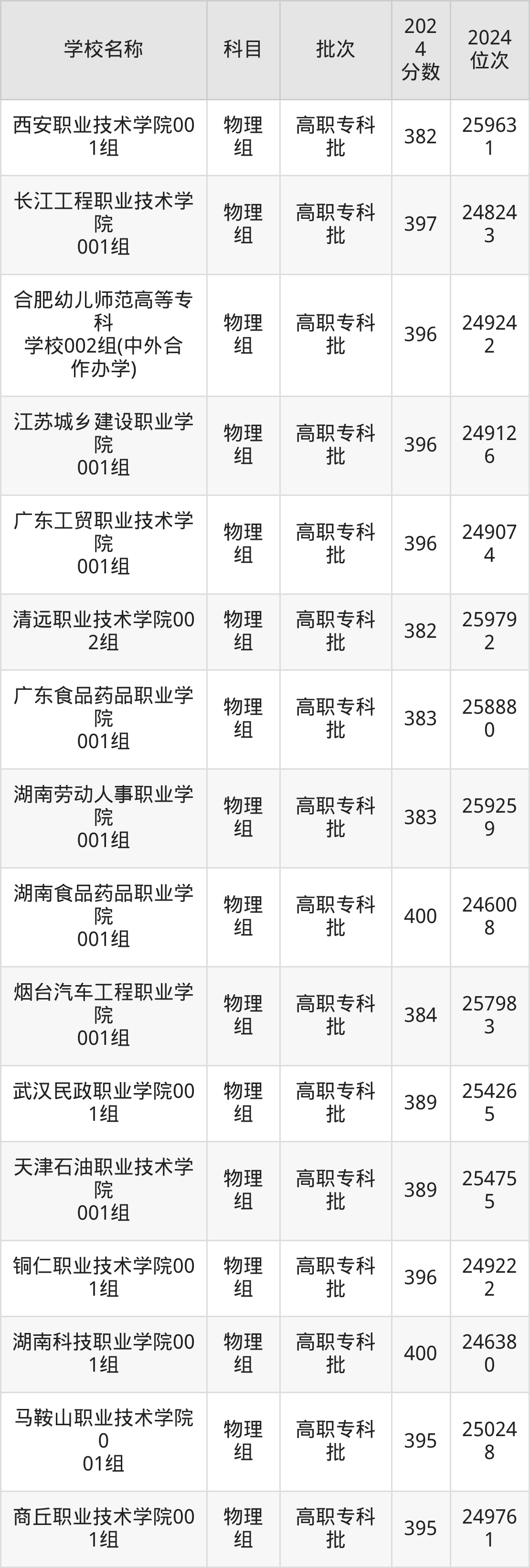 安徽高考物理组共有85所公办专科学校在380到400分之间录取,包含湖南科技职业学院、湖南食品药品职业学院、上海行健职业学院、河北机电职业技术学院、武汉警官职业学院、广东理工职业学院、上海闵行职业技术学院、上海现代化工职业学院、邯郸幼儿师范高等专科学校、宝鸡职业技术学院。